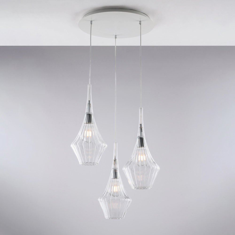 Elegante e luminosa, esta luminária pendente artesanal em ferro com vidro Pyrex é uma solução de iluminação com um toque contemporâneo e refinado. Os três difusores de vidro Pyrex , com suas formas geométricas e facetadas, difundem a luz harmoniosamente, criando um efeito visual leve e sofisticado.