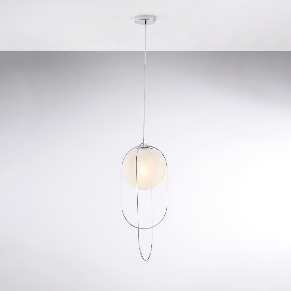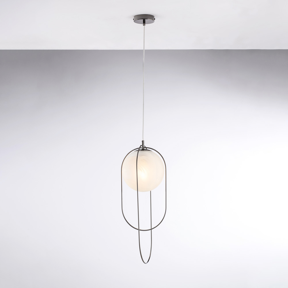 Simples e sofisticada, esta luminária pendente de ferro com esfera de vidro é uma solução de iluminação contemporânea, concebida para quem aprecia linhas puras e elegância discreta. A estrutura metálica esbelta abriga uma esfera luminosa de 20 cm de diâmetro , criando um equilíbrio refinado entre forma e luz.