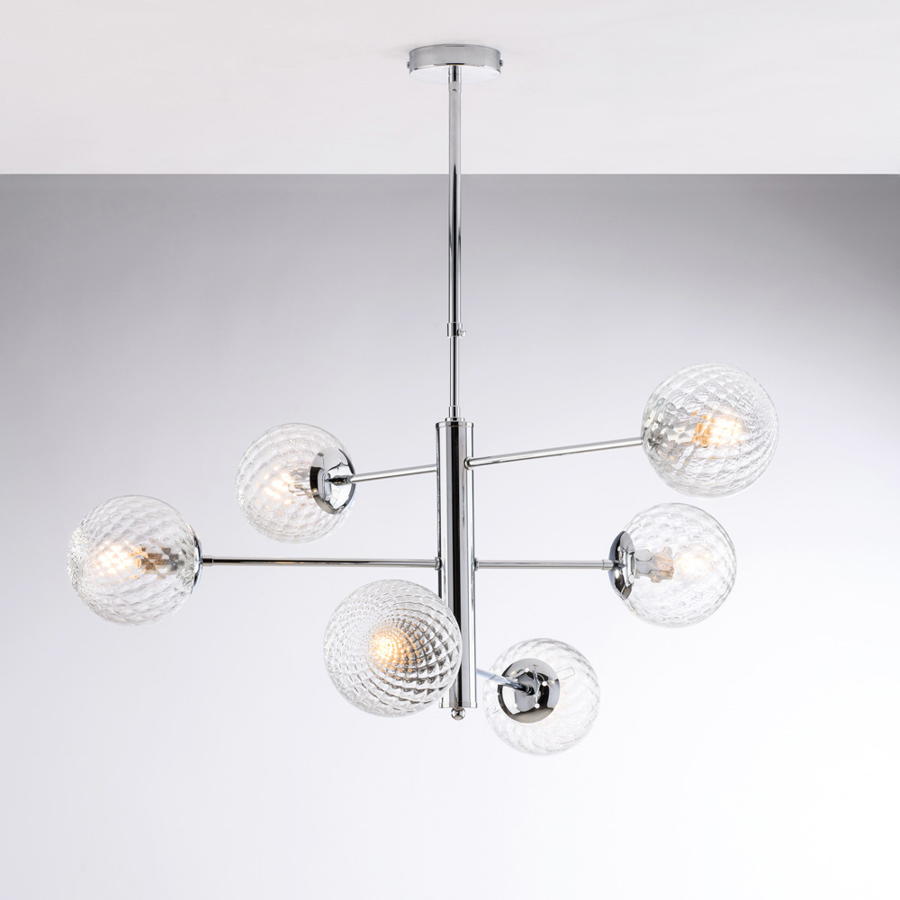Elegante e contemporânea, esta luminária pendente de ferro feita à mão destaca-se pela sua composição geométrica equilibrada. Os braços horizontais sustentam difusores de vidro esféricos, criando uma interação refinada de simetrias que projeta uma luz difusa e harmoniosa.