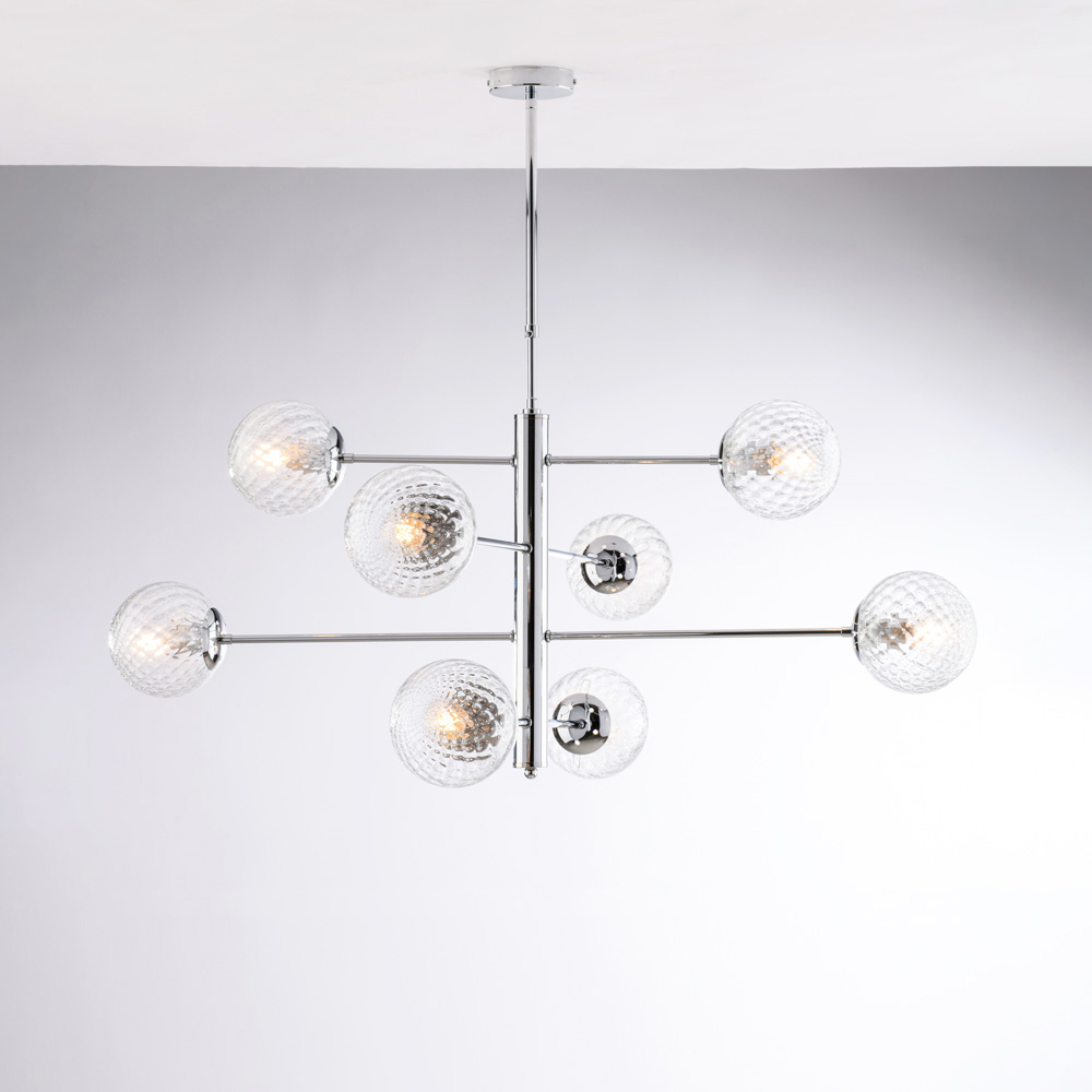 Disponível nos acabamentos cromado polido ou bronze , este candeeiro de teto integra-se naturalmente em salas de estar modernas , salas de jantar , espaços abertos , ambientes de design e espaços comerciais . A combinação de metal e vidro expressa a excelência do artesanato italiano , com particular atenção aos detalhes e proporções.
