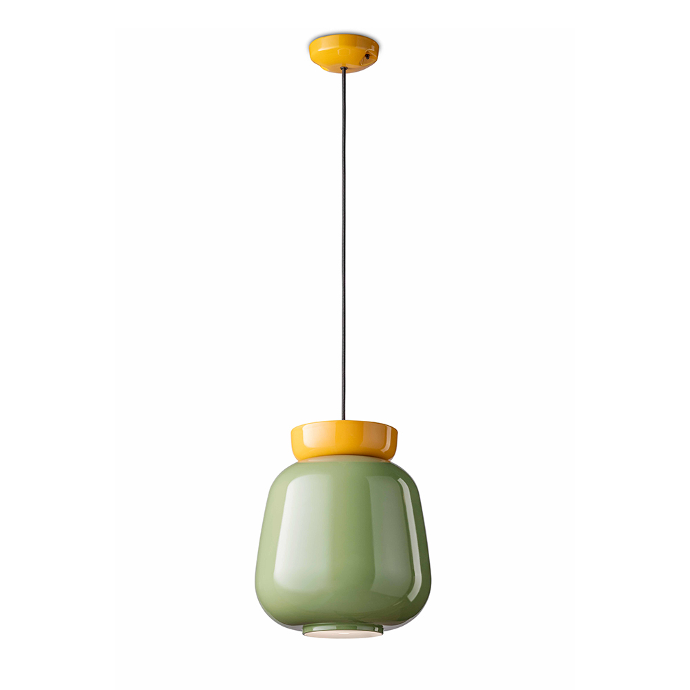 Candeeiro de suspensão em cerâmica colorida , difusor em vidro pintado e cabo revestido em algodão, inteiramente Fabricado na Itália.