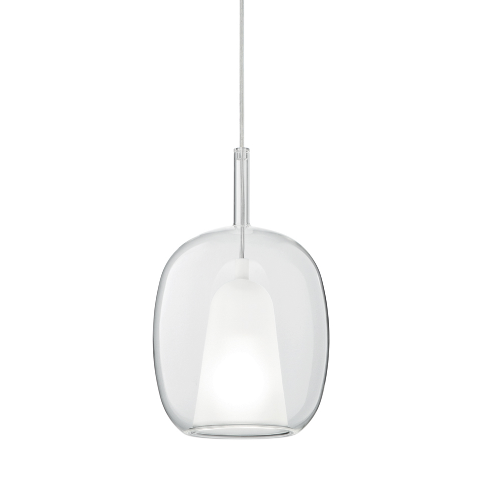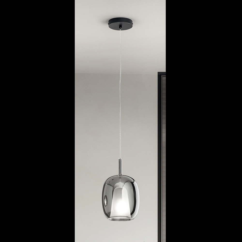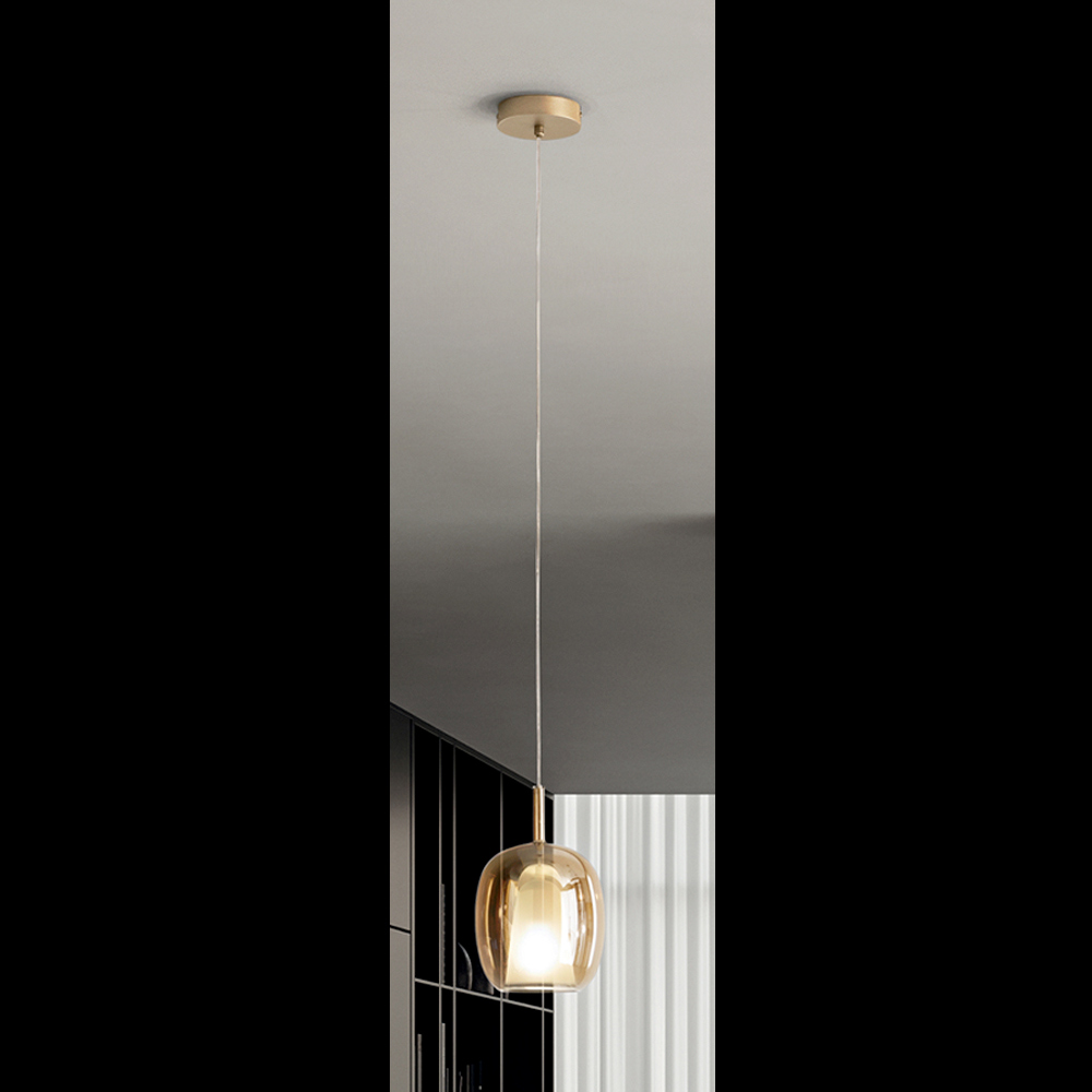 Luminária feita com base de teto em metal e difusor em vidro soprado , caracterizada por dupla camada: interna em vidro acetinado e externa em vidro colorido . Tampa em material polimérico para estabilizar o cabo em posição central. Cabo ajustável.