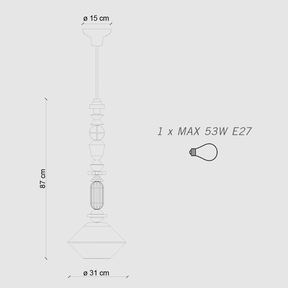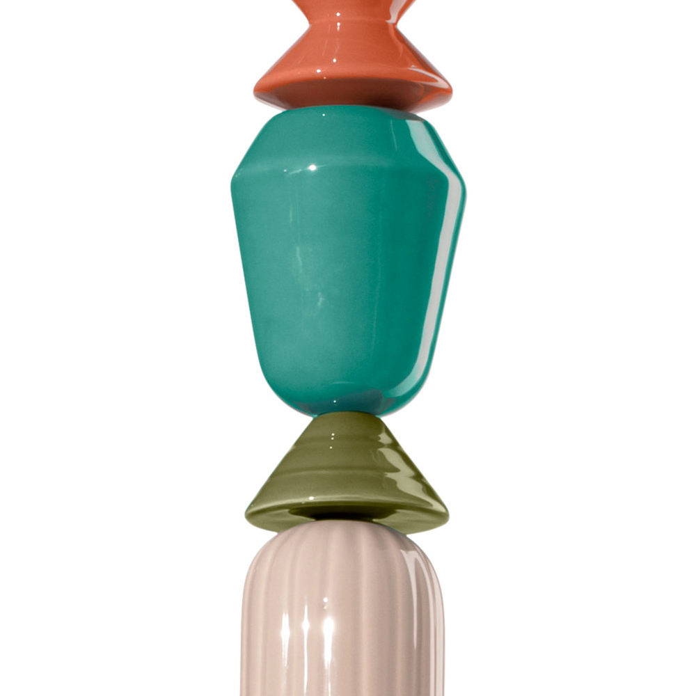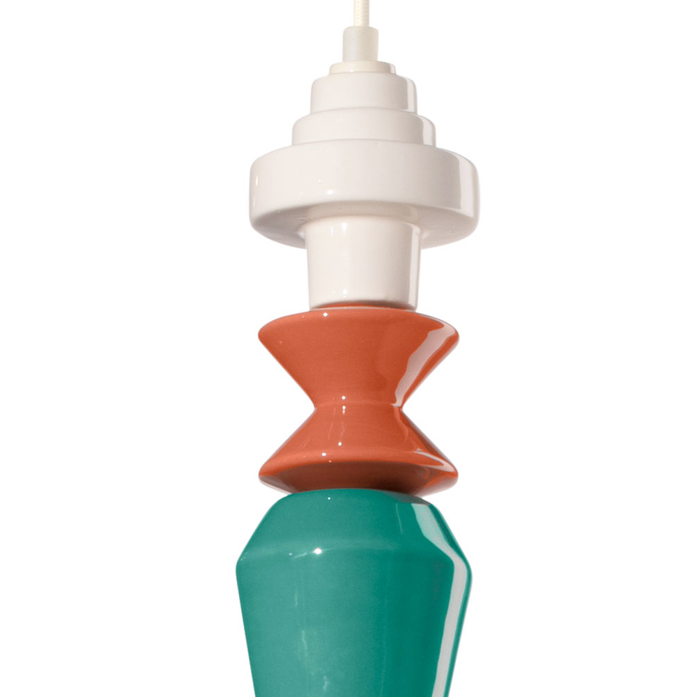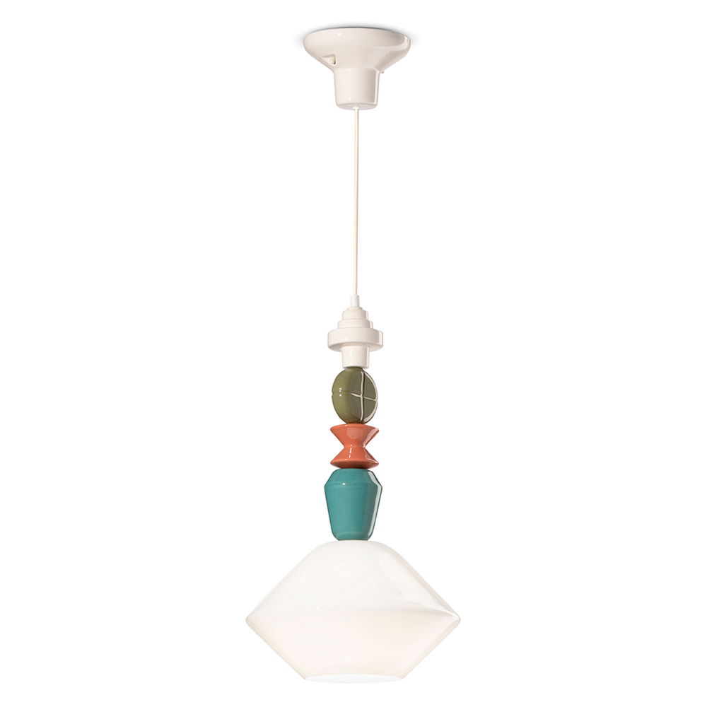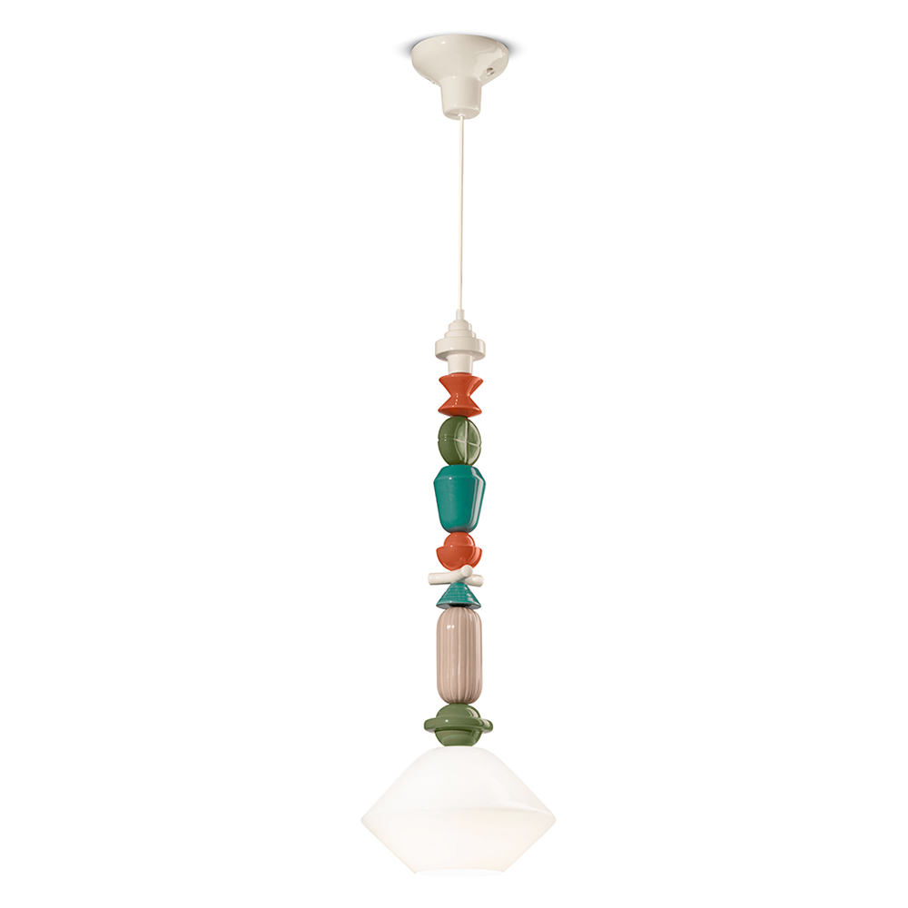 Este candeeiro suspenso é uma obra de arte iluminadora que combina o calor da cerâmica com a transparência do vidro. Com suas formas geométricas e sequência de elementos coloridos , esse móvel é como um totem de luz e cor que confere personalidade e vivacidade a qualquer ambiente.