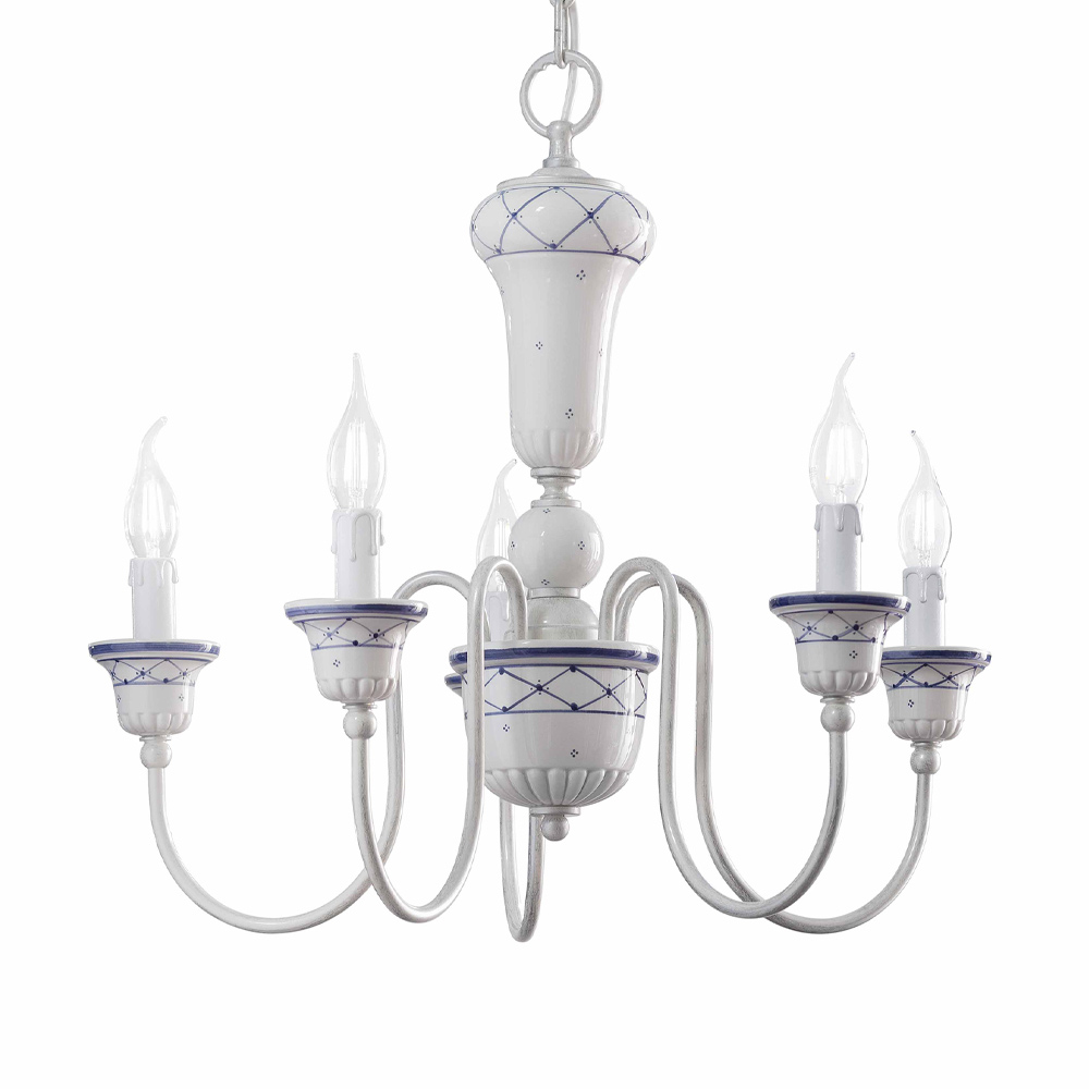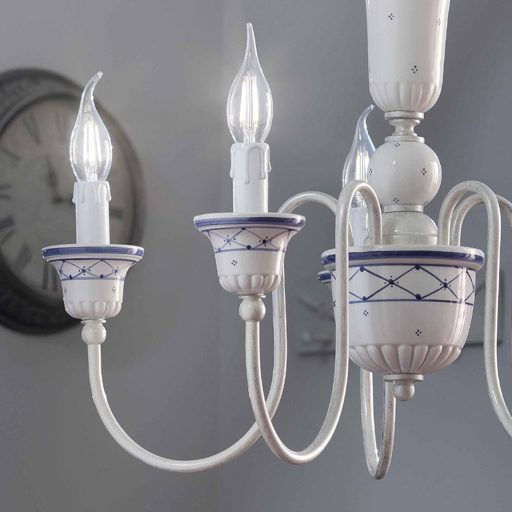Latão de 5 lâmpadas feito à mão e lustre de cerâmica pintado à mão feito na Itália pela Ferroluce.