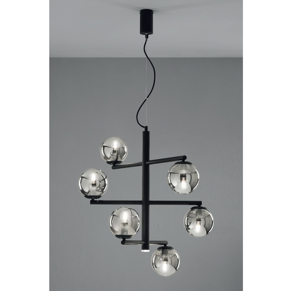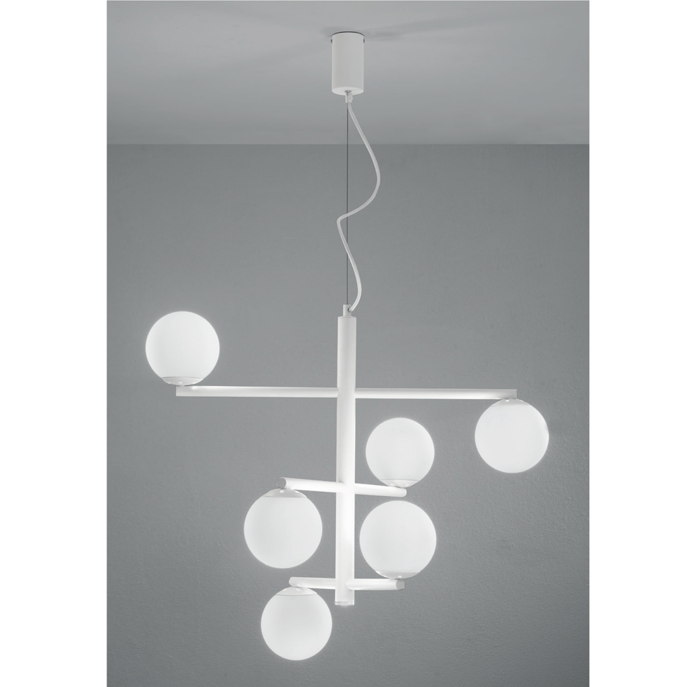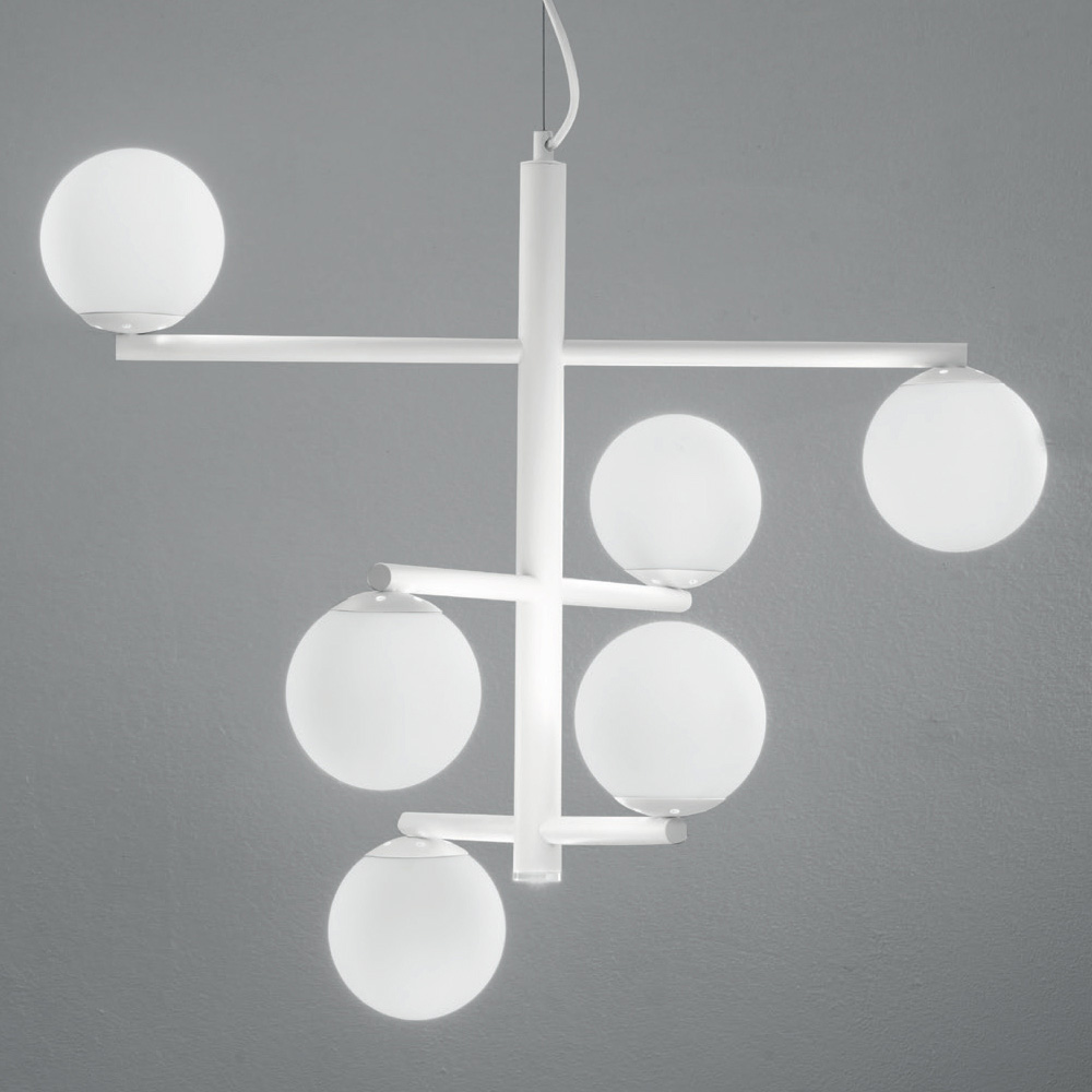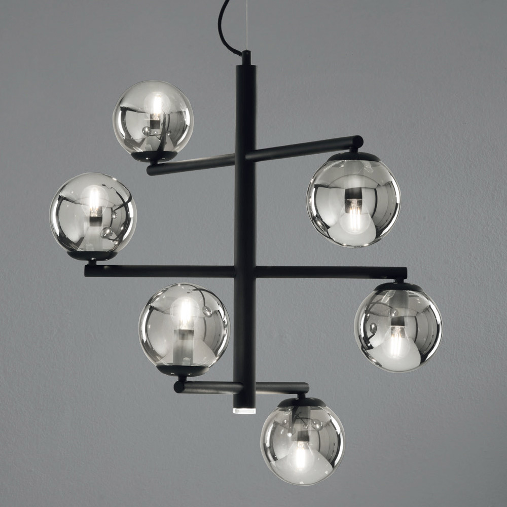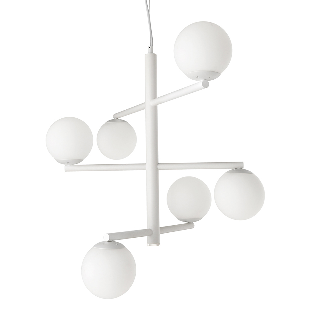 Lustre de 6 luzes em metal pintado e vidro soprado, design moderno.