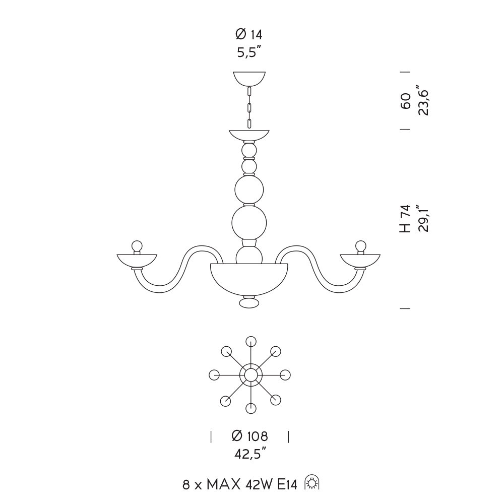Acabamentos disponíveis: Lâmpadas (não incluídas) : 8 x MAX 42W E14