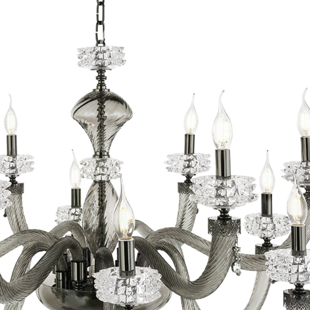 Candelabro de 12 luzes em vidro e metal artesanal, design de luxo italiano.