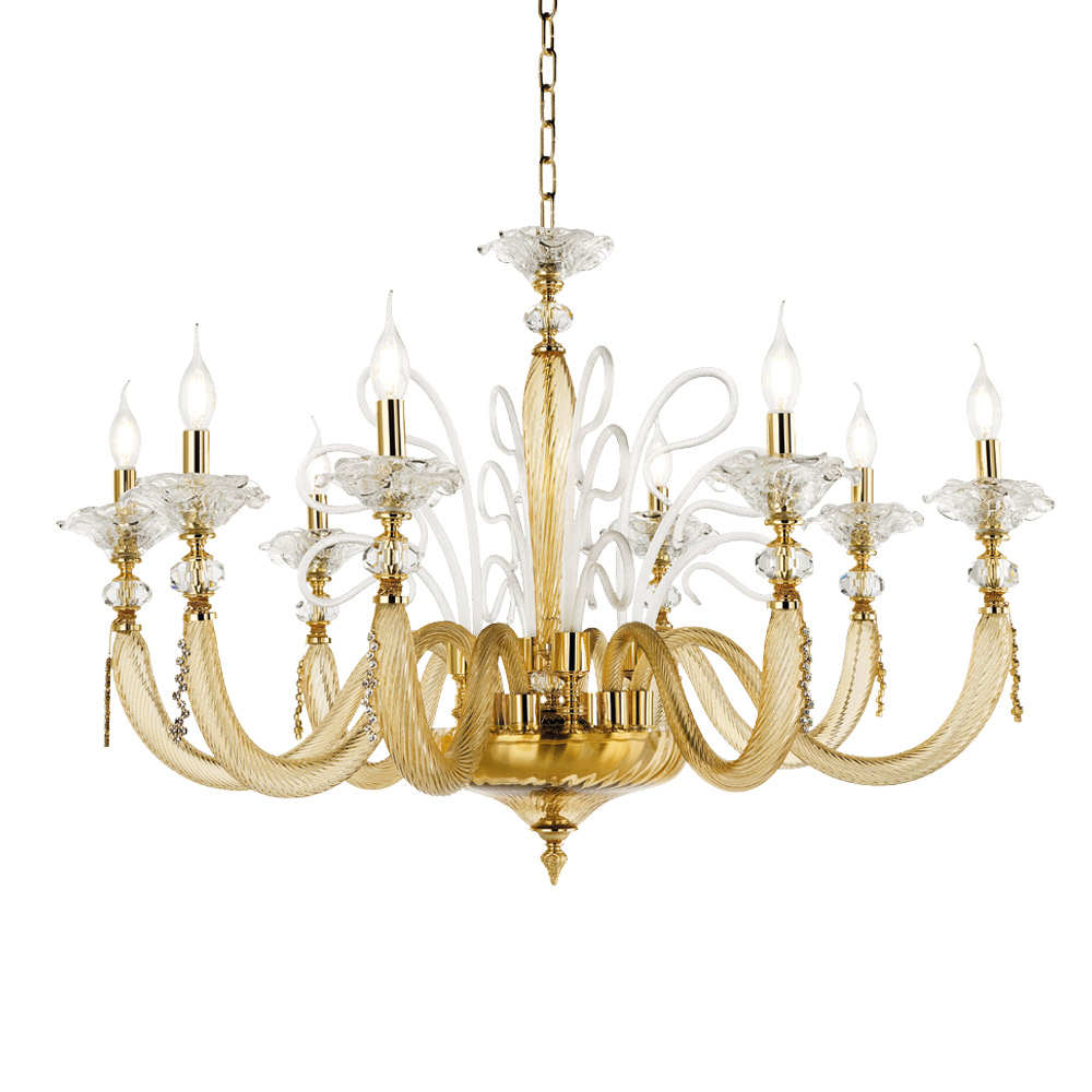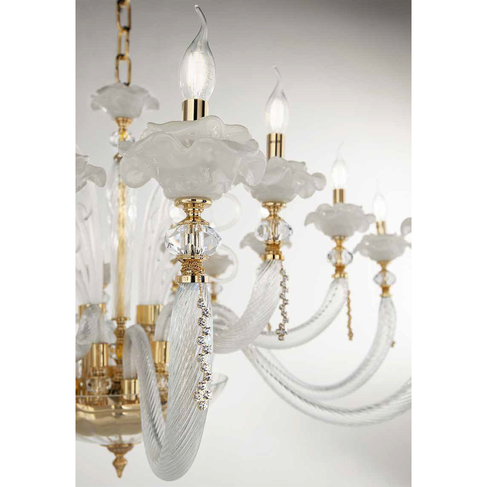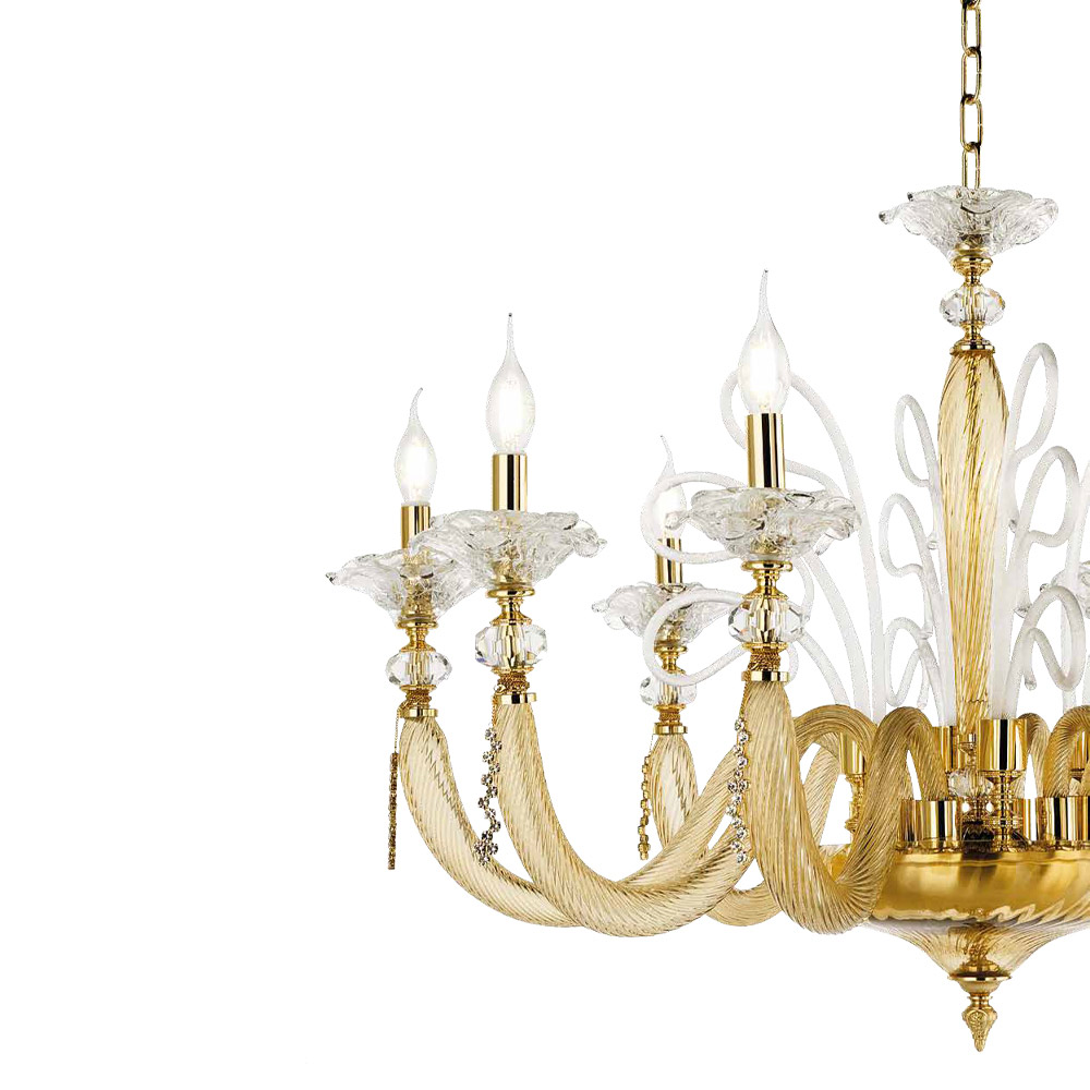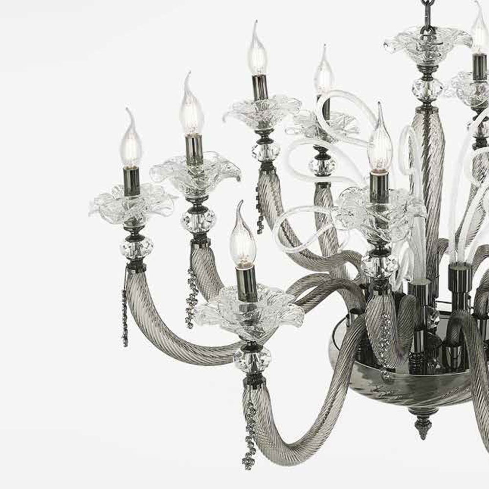 Candelabro artesanal de 8 luzes em vidro soprado e decorações florais, luxo italiano.