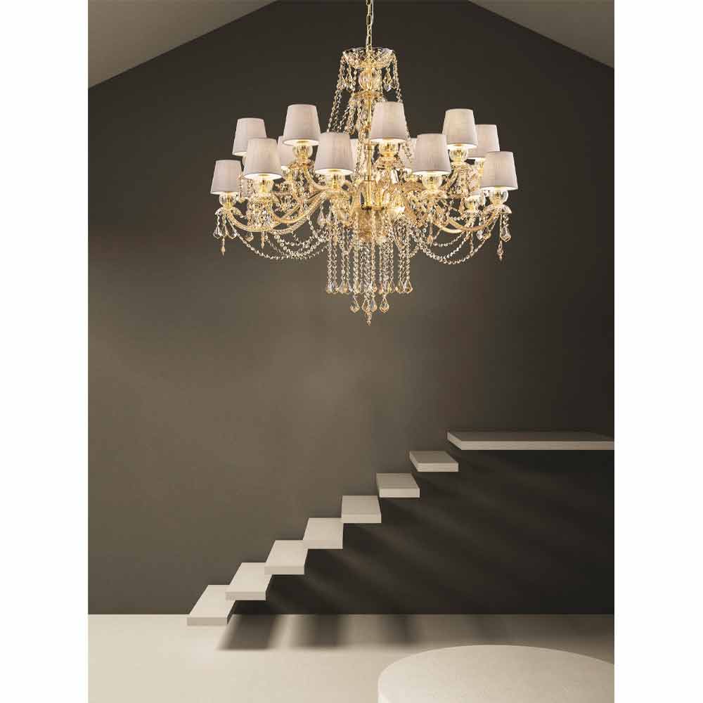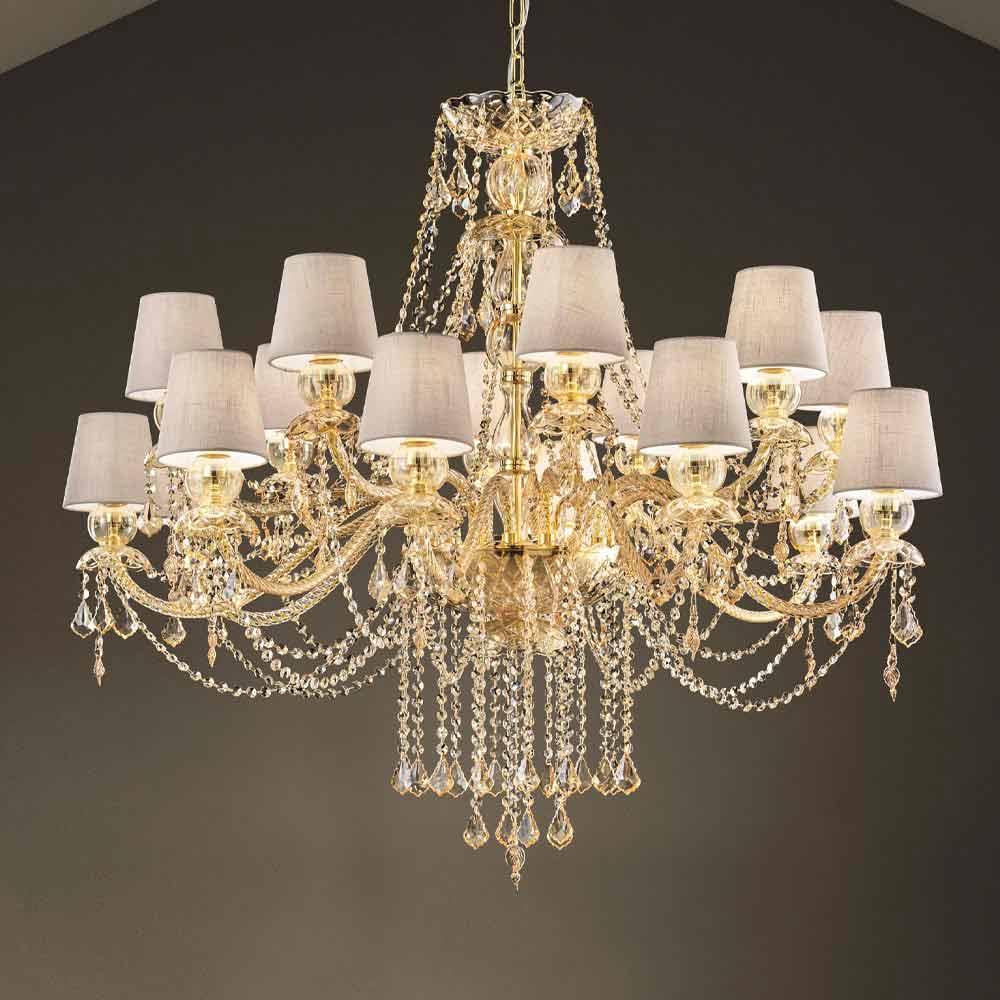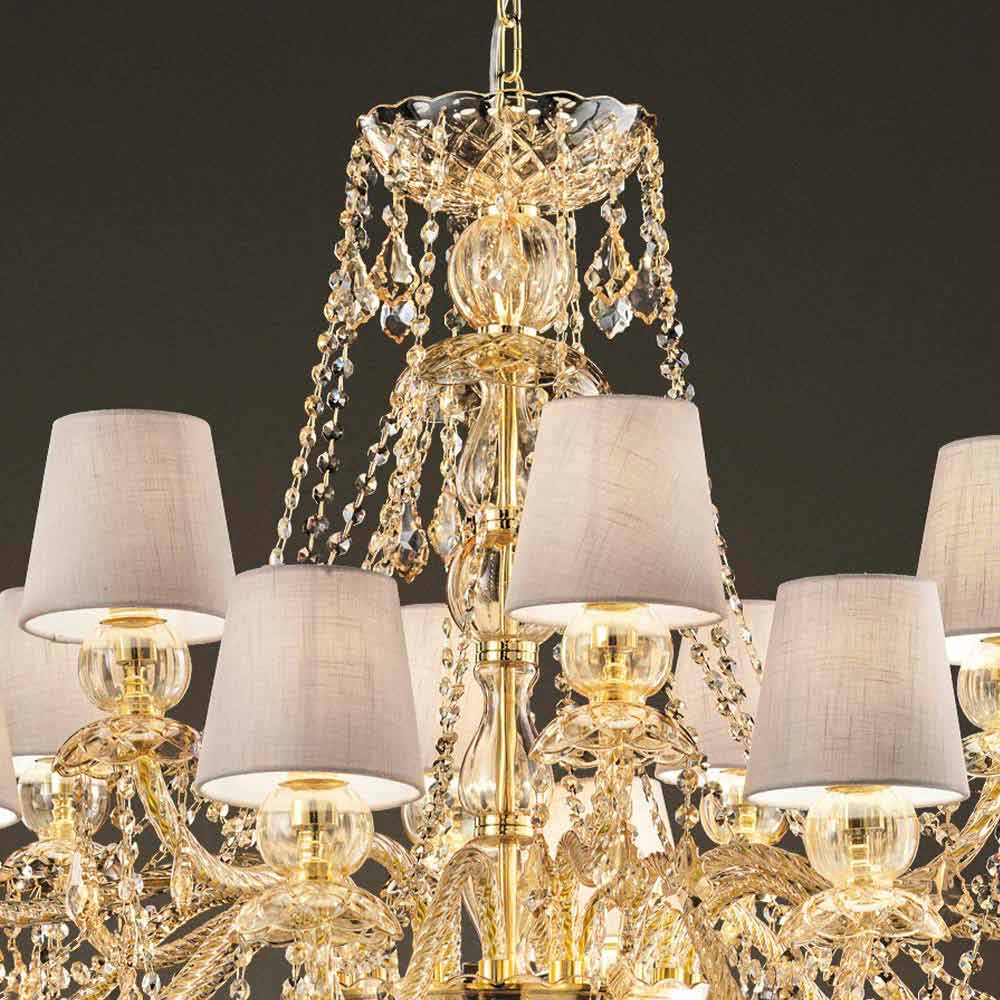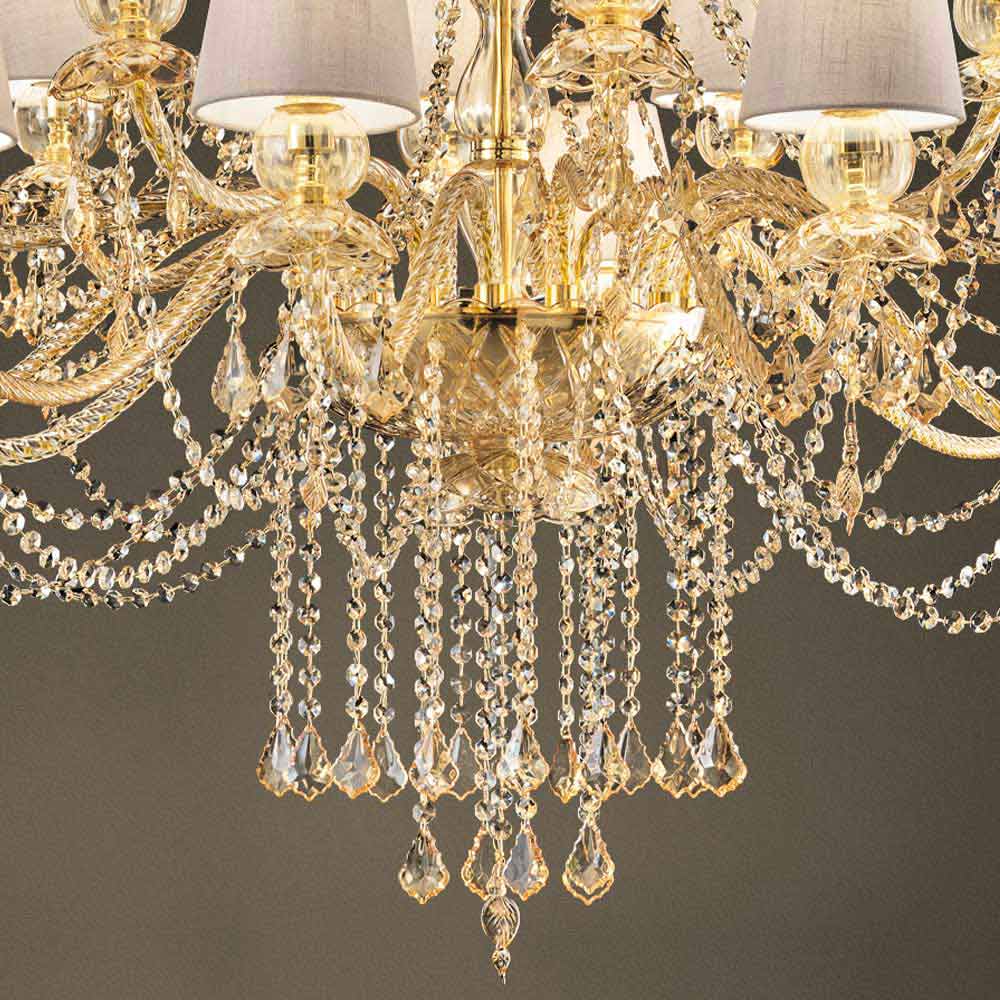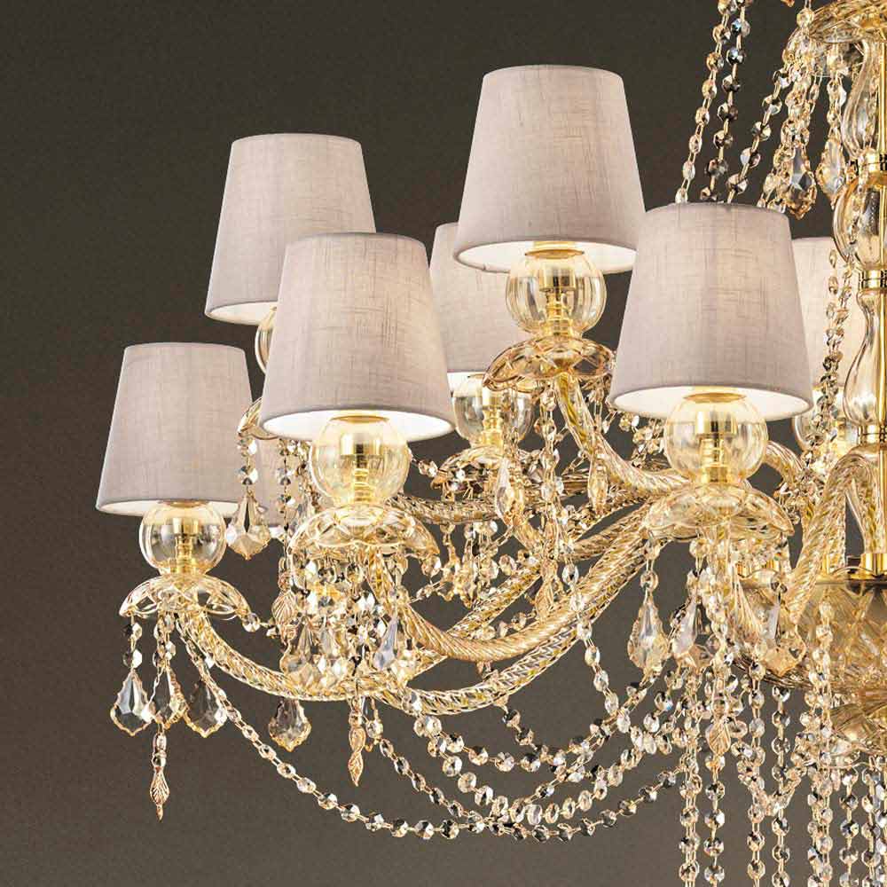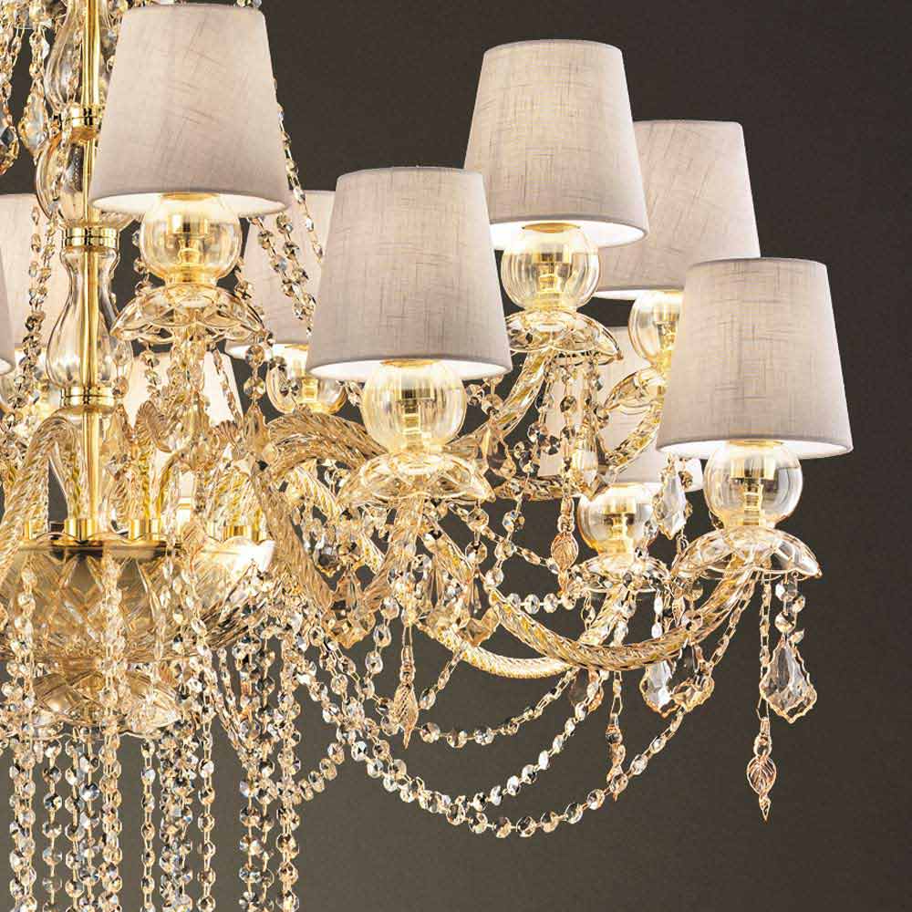Lustre refinado com acabamento âmbar Estrutura de vidro de Veneza enriquecida por elementos em acabamento cristal, 16 abajures de linho e detalhes em metal dourado brilhante , feitos à mão na Itália . Pendentes luminosos e abajures fascinantes representam as peculiaridades deste maravilhoso acessório de decoração com uma alma romântica capaz de preencher grandes salas com personalidade e estilo com elegância atemporal . A sua estética torna-se única e interessante pelas inúmeras lantejoulas que através da refração da luz criam feixes de luz coloridos e sofisticados jogos de luz e sombra para um lustre de forte impacto cenográfico .