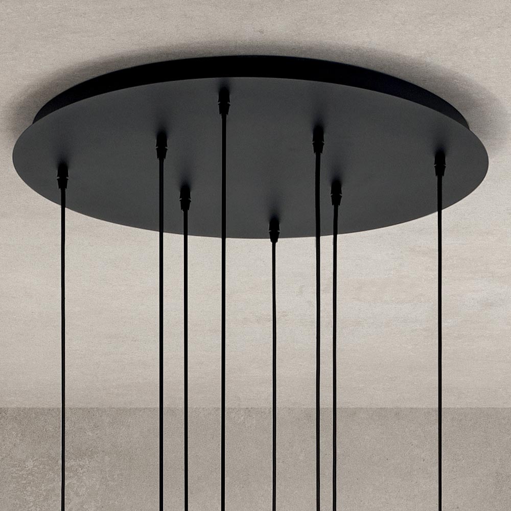 Lustre feito em vidro soprado em formato esférico com linha hemisférica dividida em duas partes: uma transparente e uma colorida. Estrutura em metal pintado preto fosco e base no teto em metal preto . Cabos ajustáveis com comprimento máximo de 250 cm.