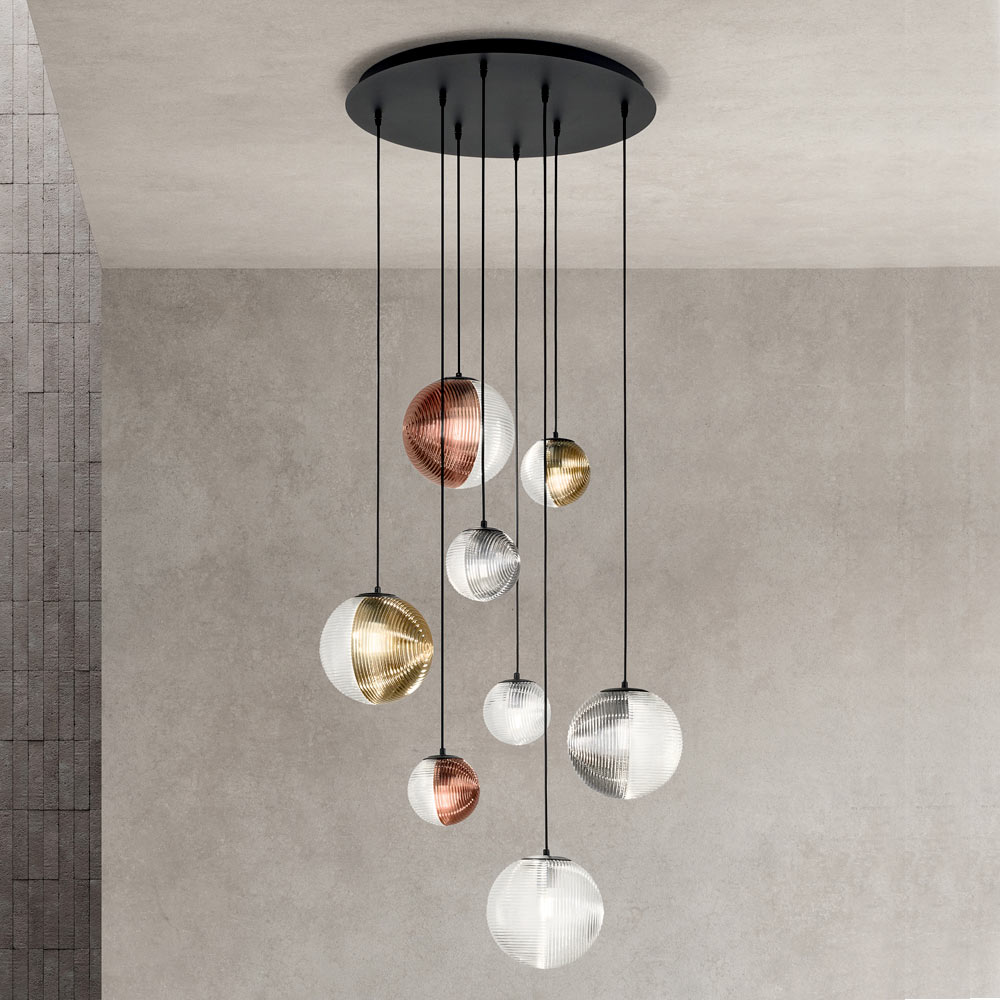 Mergulhe em uma atmosfera de elegância moderna com este lustre pendente, perfeito para adicionar um toque de luxo discreto a qualquer espaço. As esferas luminosas pendem em uma dança harmoniosa de luz e reflexos , cada uma encapsulada em vidro soprado com acabamentos diferentes, refletindo uma luz quente e acolhedora .