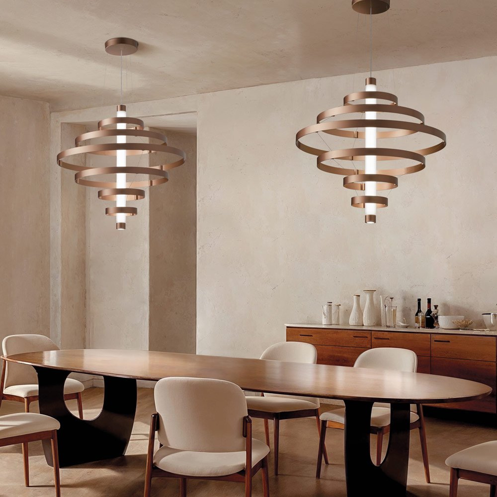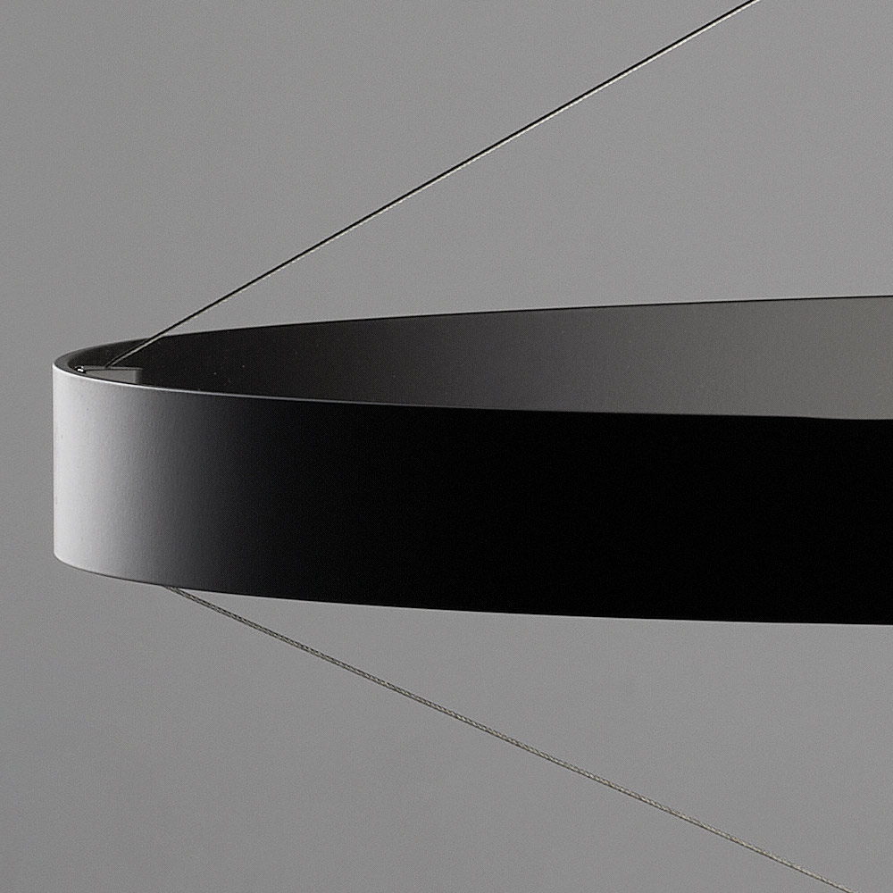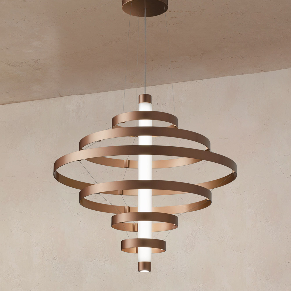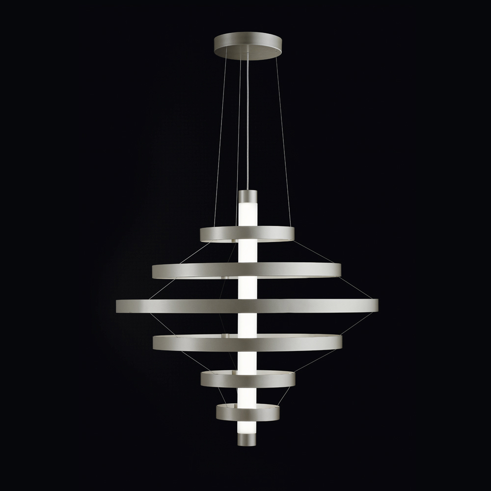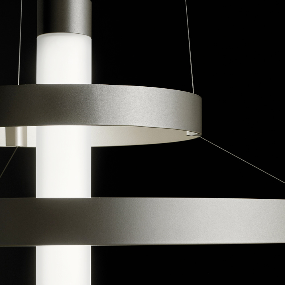 Esta luminária pendente é uma verdadeira protagonista em qualquer espaço: uma escultura luminosa que cativa o olhar e confere personalidade e prestígio ao ambiente. A estrutura é composta por uma série de anéis concêntricos de alumínio , harmoniosamente dispostos ao redor do corpo central, criando um efeito visual dinâmico, elegante e tridimensional .