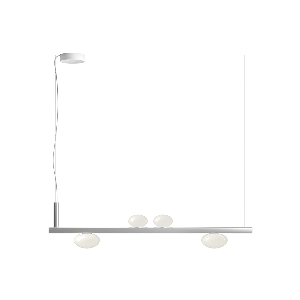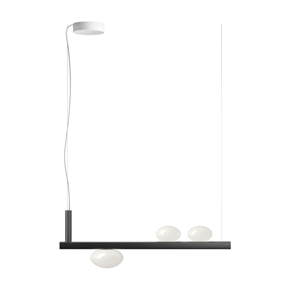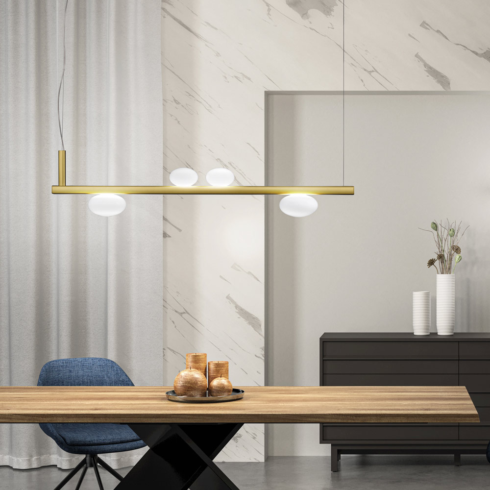 Este pendente é um verdadeiro ícone de design inteligente e tecnologia discreta . Sua estrutura limpa e linear é combinada com elegantes difusores esféricos de vidro opalino, que parecem estar suspensos em equilíbrio, criando um efeito visual moderno e leve .