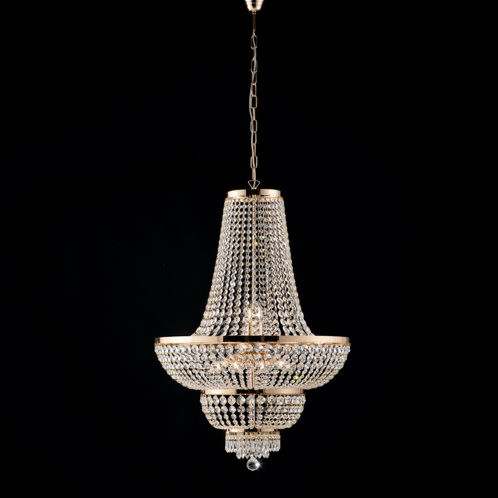 Dramático, luminoso e de grande prestígio, este lustre clássico de luxo em ferro e latão com strass foi concebido para espaços que desejam destacar-se com elegância. A estrutura esbelta, adornada com cascatas de strass brilhantes , reflete a luz, criando um jogo de reflexos refinado que valoriza qualquer ambiente.