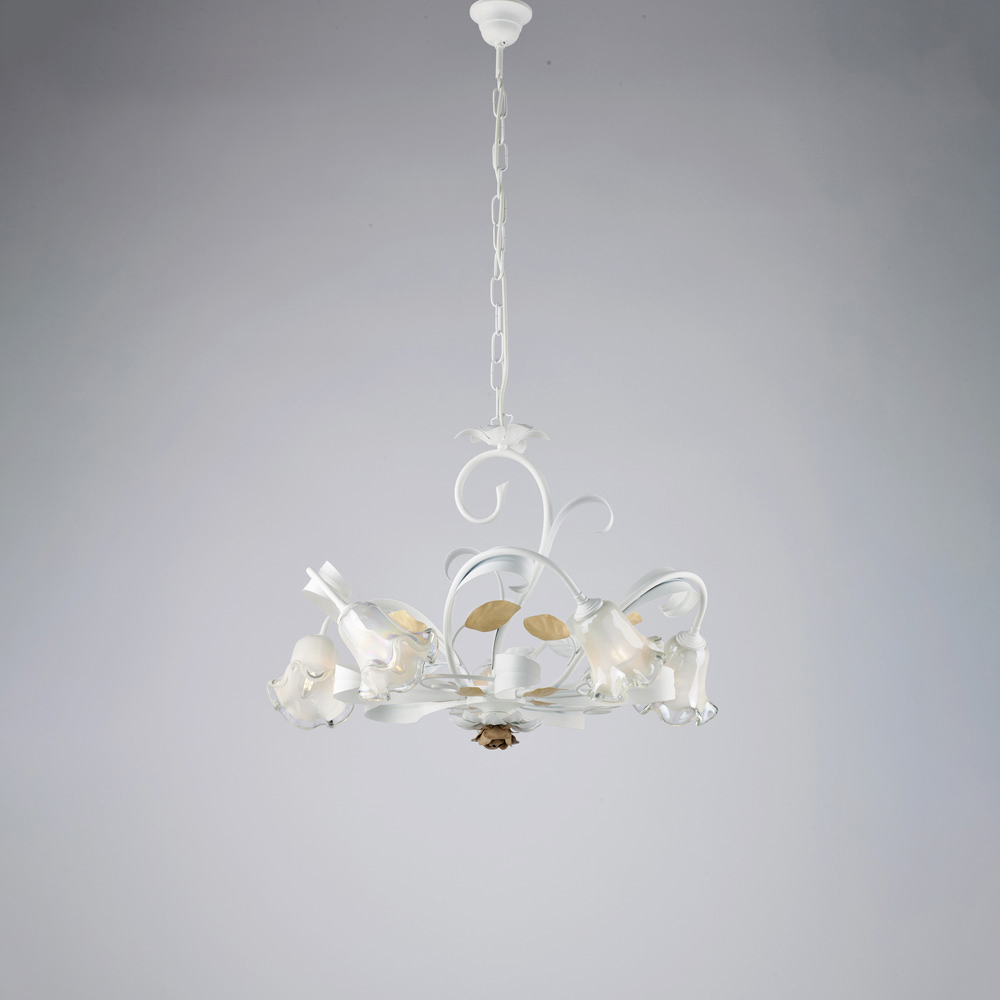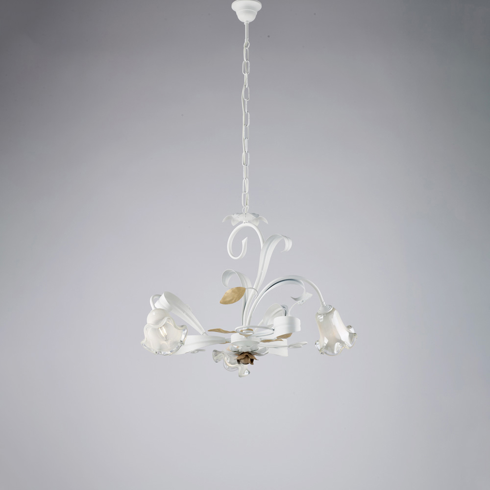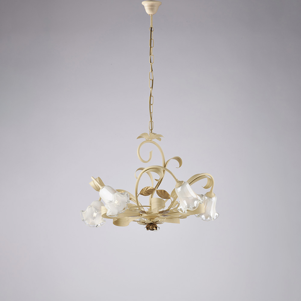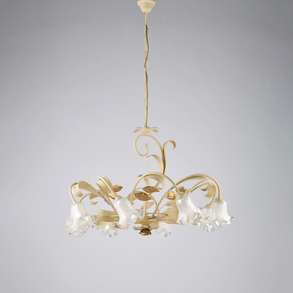 Romântico e elegante, este lustre clássico, feito à mão em ferro laqueado cor marfim, é uma criação luminosa que evoca o charme da tradição italiana, reinterpretada com requinte. A estrutura sinuosa, enriquecida com arabescos decorativos e um abajur de vidro em formato de flor , confere leveza e harmonia ao conjunto, criando uma atmosfera acolhedora e convidativa.