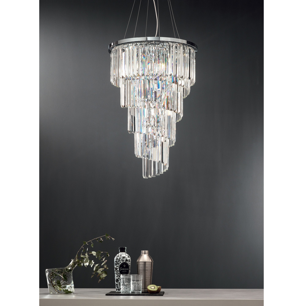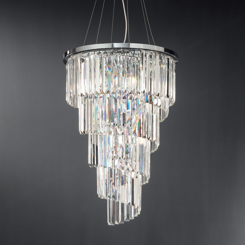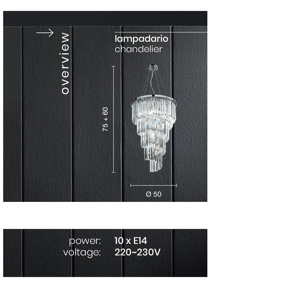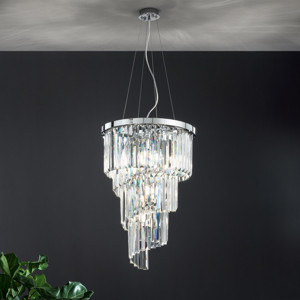 Este lustre para sala com 7 ou 10 luzes é capaz de criar ambientes luxuosos e importantes graças ao seu design precioso e luminoso.