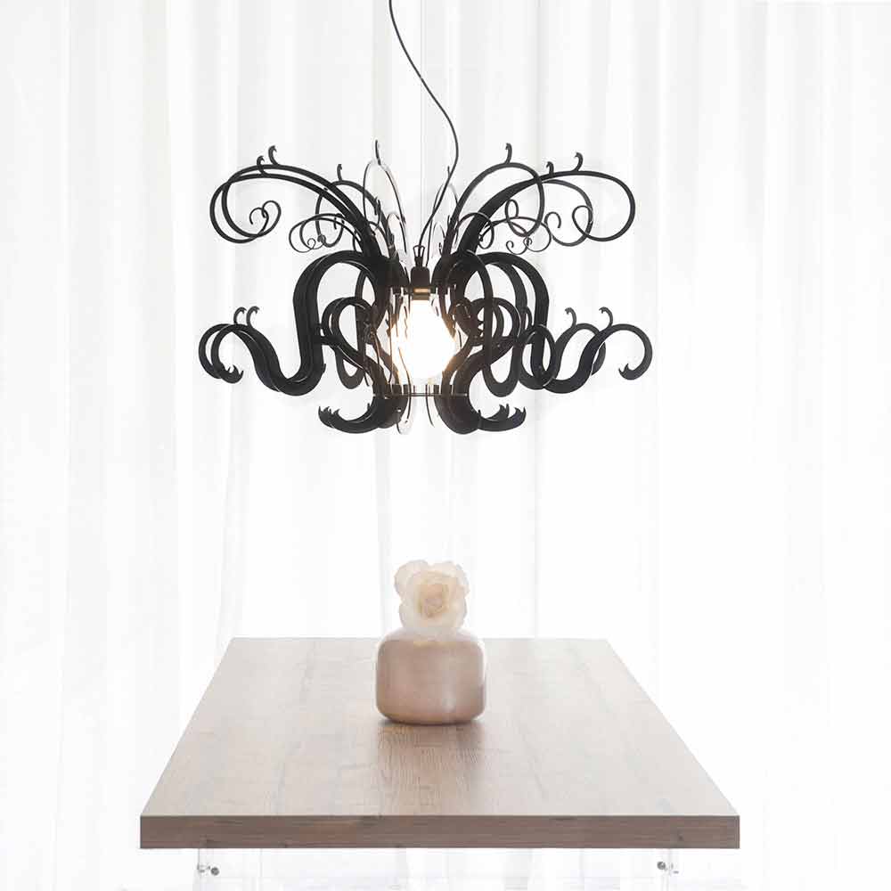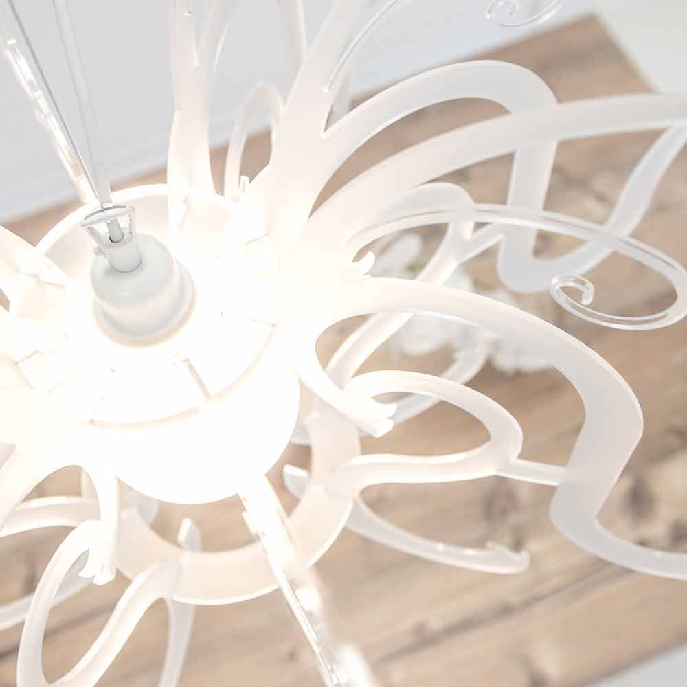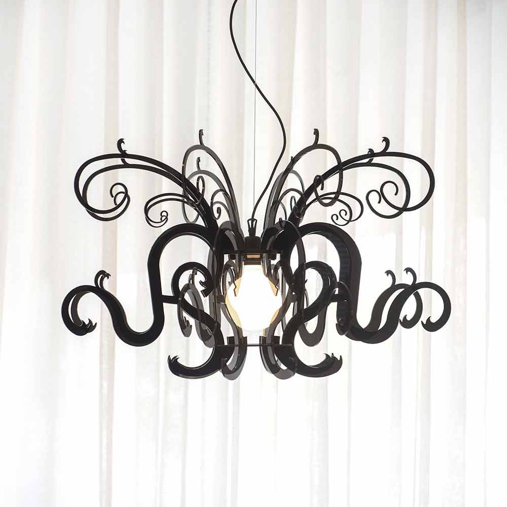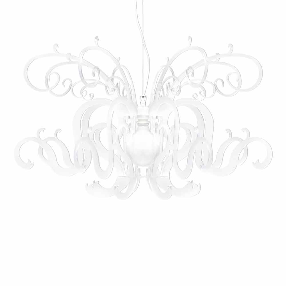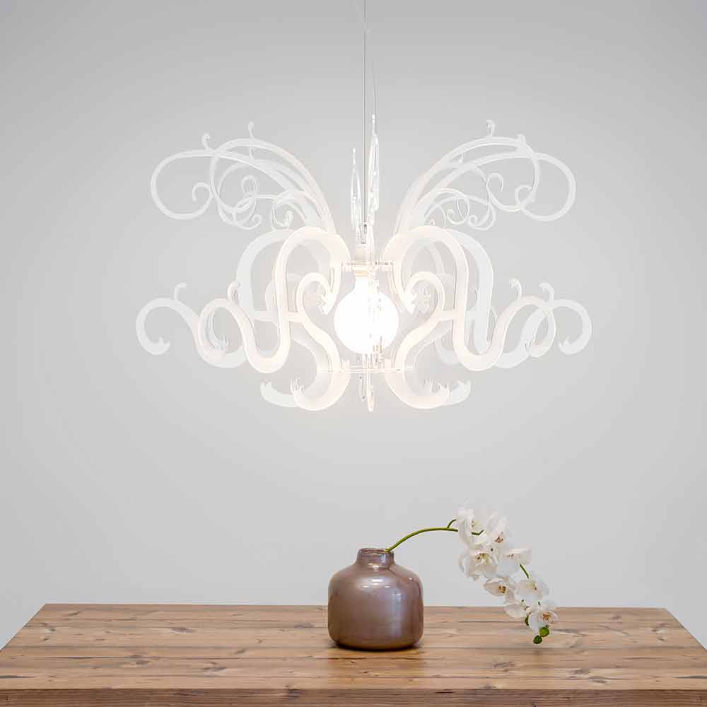 Malito é um majestoso lustre feito de polímero virgem PMMA em branco ou preto .
