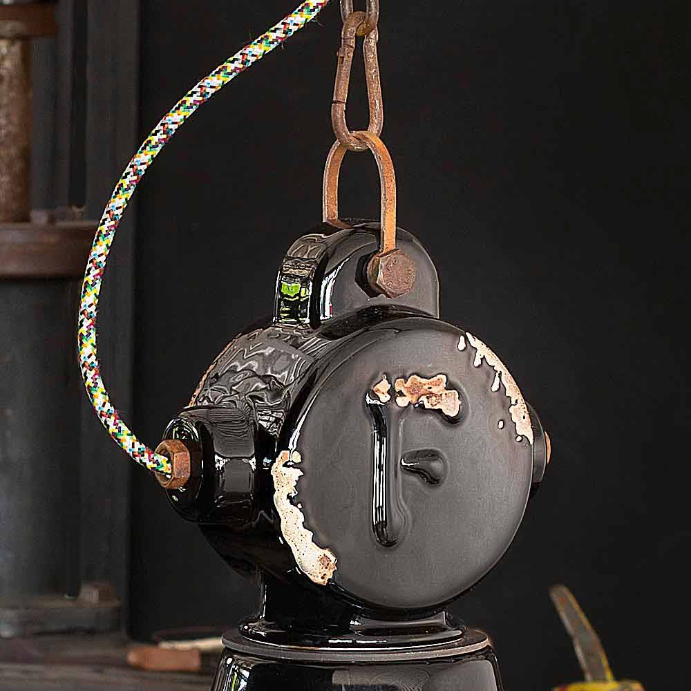 A peculiaridade desta lâmpada está no artesanato do difusor de cerâmica. A cerâmica, de fato, é decorada como se o tempo tivesse marcado seu caminho. A reprodução da erosão do tempo combinada com as superfícies brilhantes conferem esse valor extra a esta suspensão. Este efeito desgastado pelo tempo dá a Angela um estilo vintage-industrial sofisticado. A estrutura metálica amplifica ainda mais o efeito antigo.