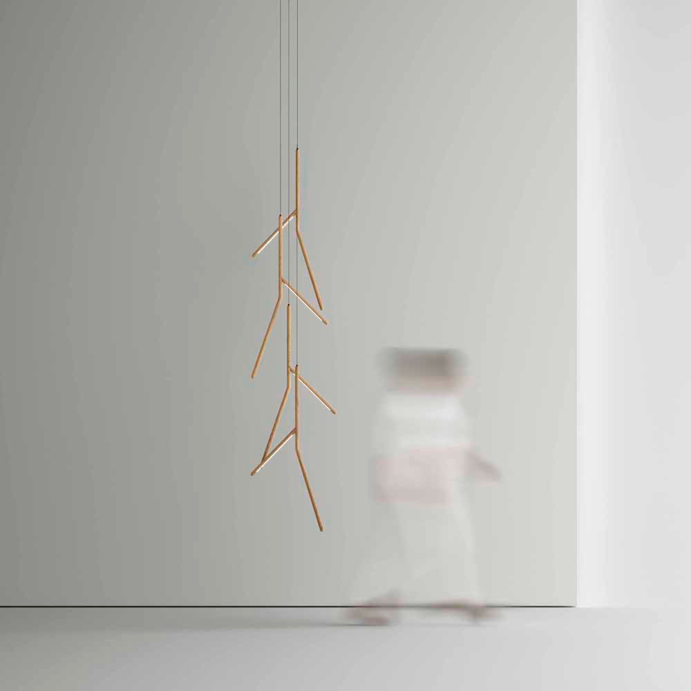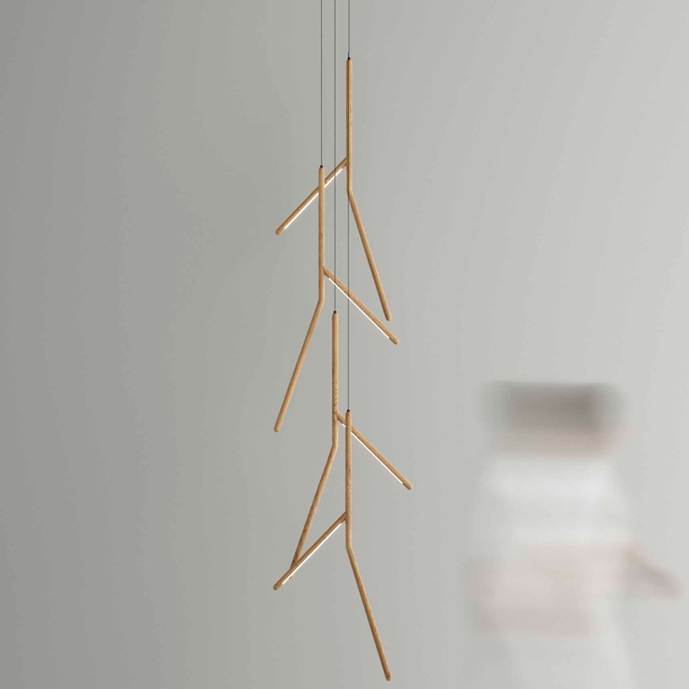 Este lustre combina o artesanato da madeira maciça com a tecnologia de iluminação. O delicado signo gráfico ganha destaque nas instalações com múltiplas luminárias, tornando-se o protagonista absoluto do ambiente.