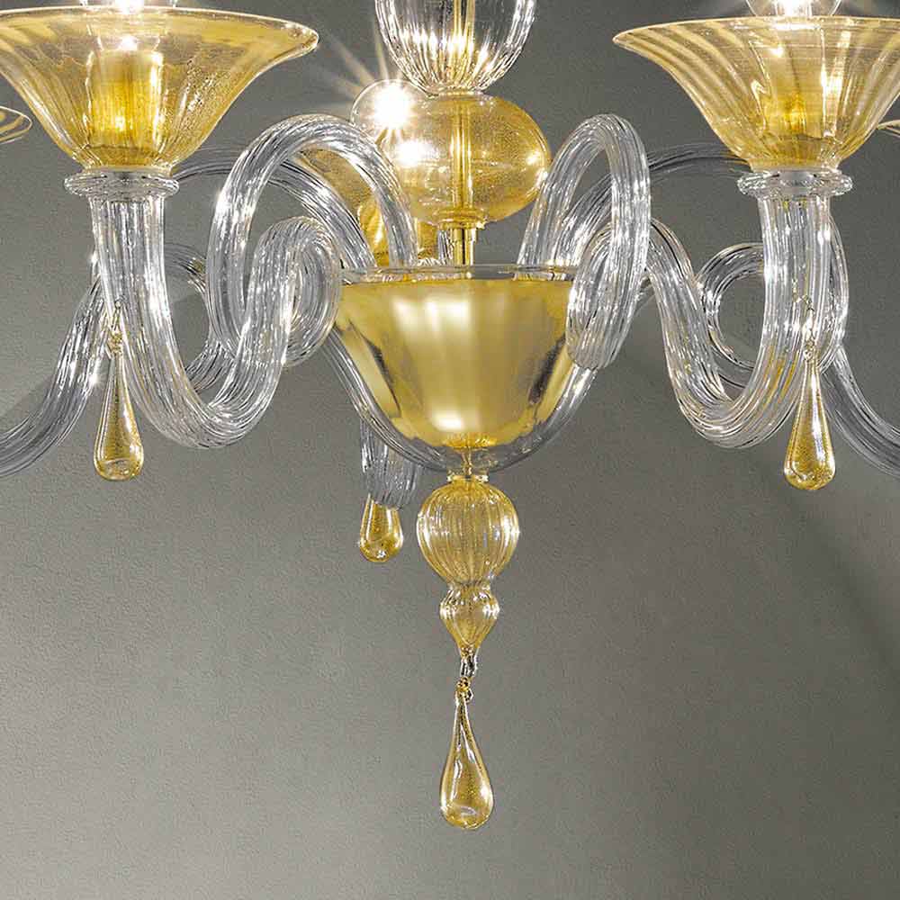 Lustre elegante feito à mão na Itália em vidro veneziano com acabamento em cristal embelezado com elementos em ouro 24 quilates aplicados a quente durante o processamento e detalhes em metal com acabamento dourado brilhante . Uma figura imponente e refinada, ideal para iluminar ambientes de grandes dimensões com elegância, nos quais cria atmosferas do passado. Sua peculiaridade é a utilização de matérias-primas extremamente preciosas, finamente trabalhadas para dar vida a novas formas como as dos braços atados e listrados para um resultado exclusivo e de alto valor . Os detalhes em ouro valorizam ainda mais, dando vida a uma ideia de iluminação que incorpora características clássicas revisitadas em tom contemporâneo para dar versatilidade, permitindo que o lustre faça parte de qualquer tipo de ambiente.