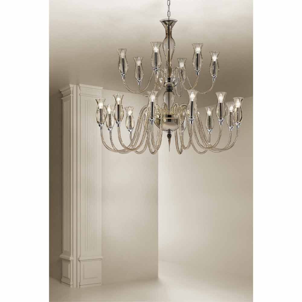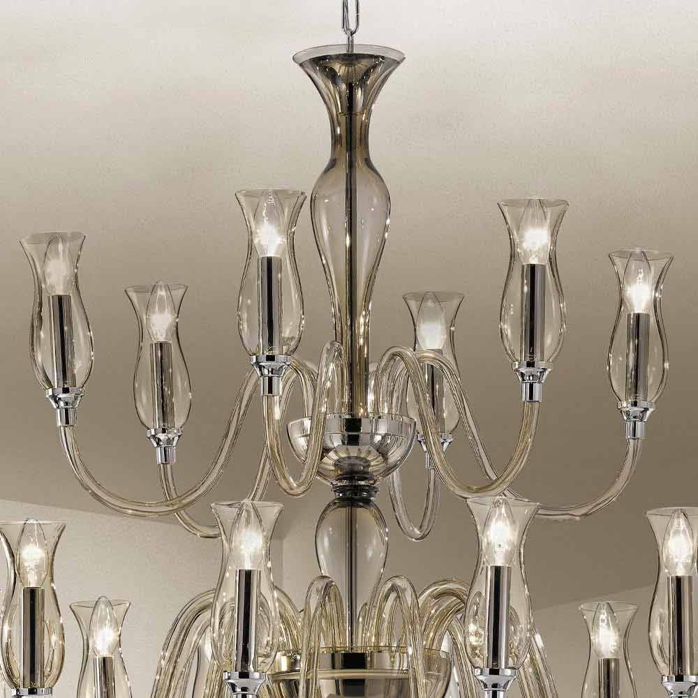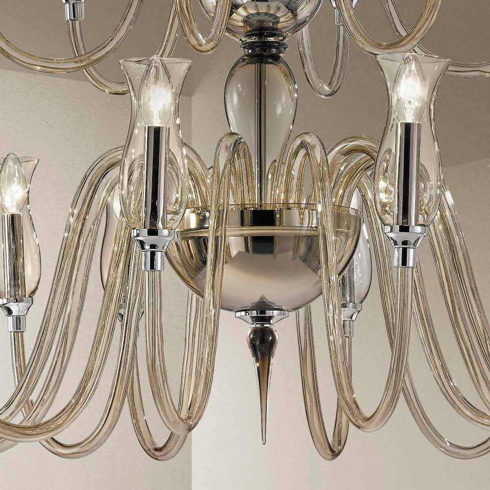 Lustre fino e delicado de 18 luzes feito à mão em vidro Veneza com acabamento fumê com detalhes em metal cromado polido , Fabricado na Itália . Da reinterpretação das formas clássicas e nobres do vidro , nasce uma nova fórmula de beleza , caracterizada por linhas sinuosas e essenciais que, redefinindo formas tradicionais, dão vida a uma solução de mobiliário capaz de completar com personalidade qualquer ambiente. O que enriquece a estética é a superfície lisa do vidro que permite que a luz deslize em diferentes direções por jogos de transparências que se combinam com os efeitos da luz vibrante para um resultado exclusivo com forte impacto visual .