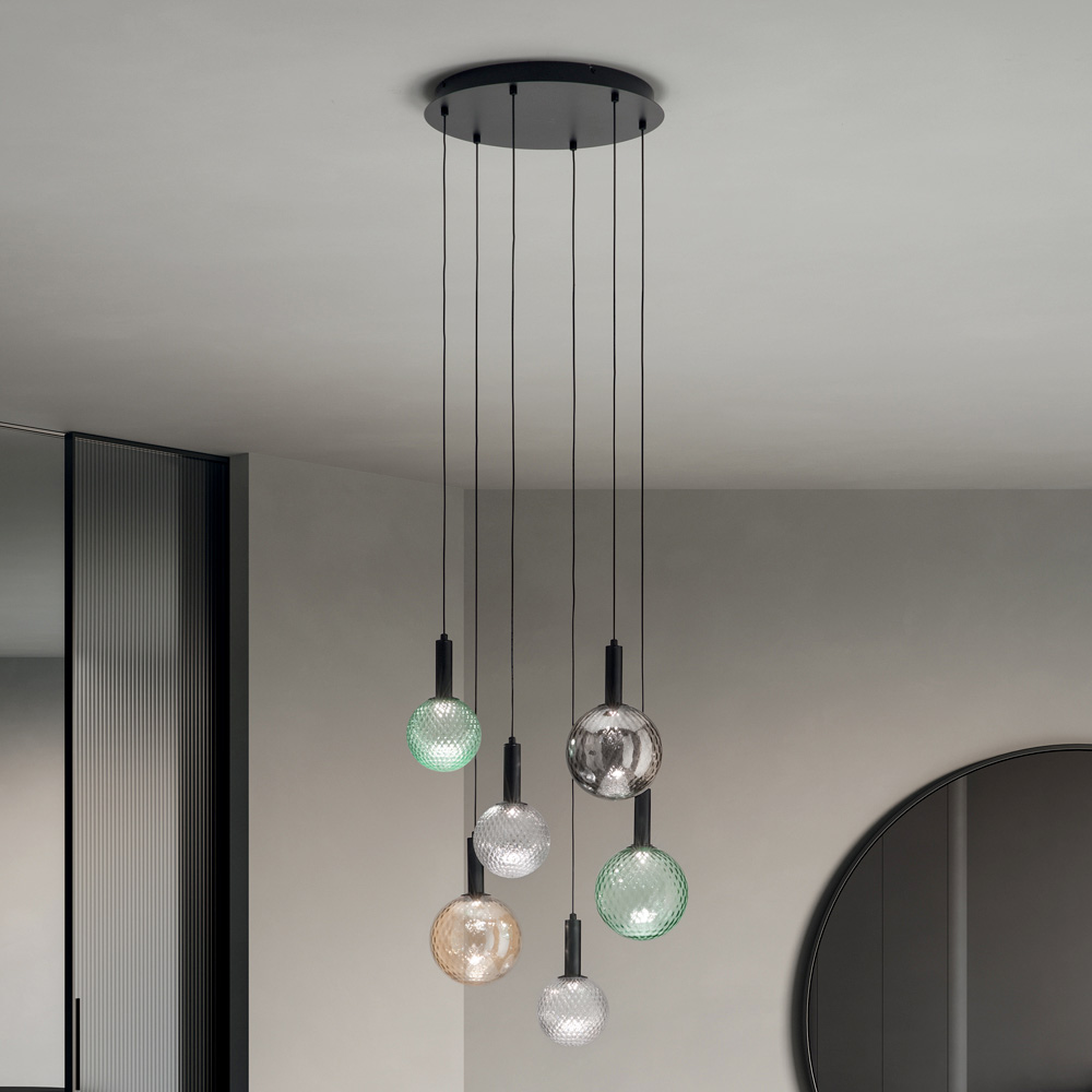 Perfeito acima de uma mesa de jantar ou como um ponto focal em uma sala de estar contemporânea , cada esfera é pendurada com precisão, criando uma composição que é tão artística quanto funcional . Os diferentes acabamentos de tons de vidro adicionam um toque de classe e distinção a qualquer espaço, refletindo a luz de maneiras que chamam a atenção e iluminam o ambiente.