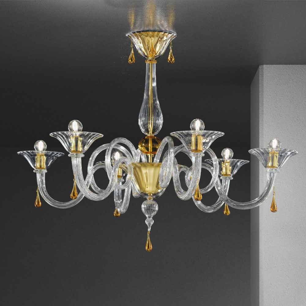 Lustre elegante e requintado com um design clássico feito à mão na Itália em vidro colorido de Veneza com acabamento em cristal e âmbar com detalhes em metal dourado brilhante . Linhas tradicionais que evoluem para dar vida a um estilo versátil , adequado também para grandes espaços com mobiliário moderno em que se joga com contrastes para uma iluminação única e exclusiva . A sua rigorosa elegância é marcada pelo equilíbrio e simetria , elementos que conferem à estética do lustre a sua personalidade imponente e o seu elevado valor . O design é enriquecido pela forma sem precedentes dos braços modelados durante o processamento do vidro soprado para um resultado criativo e fascinante .