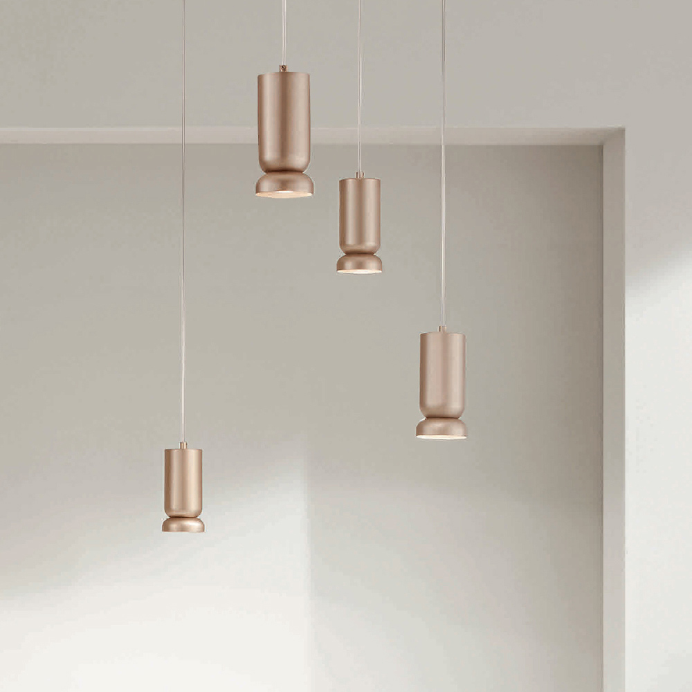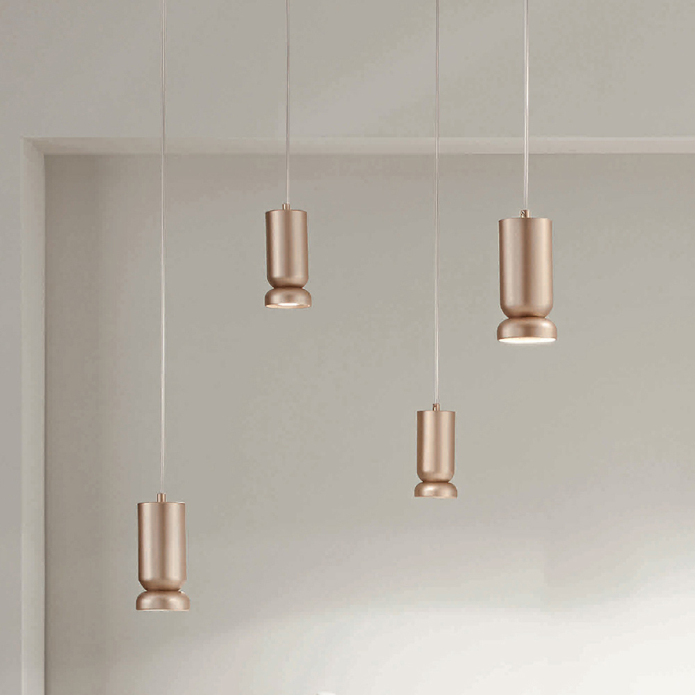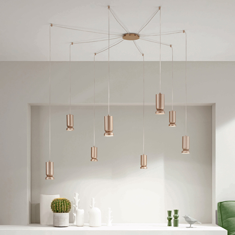 alumínio lacado a pó com acabamento dourado. Todos os cabos são ajustáveis, tanto em largura no teto como em comprimento com as luzes.