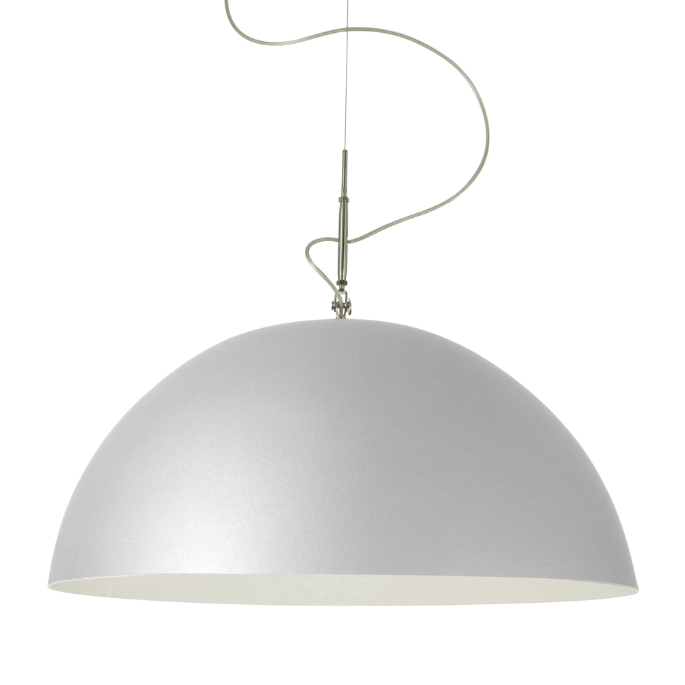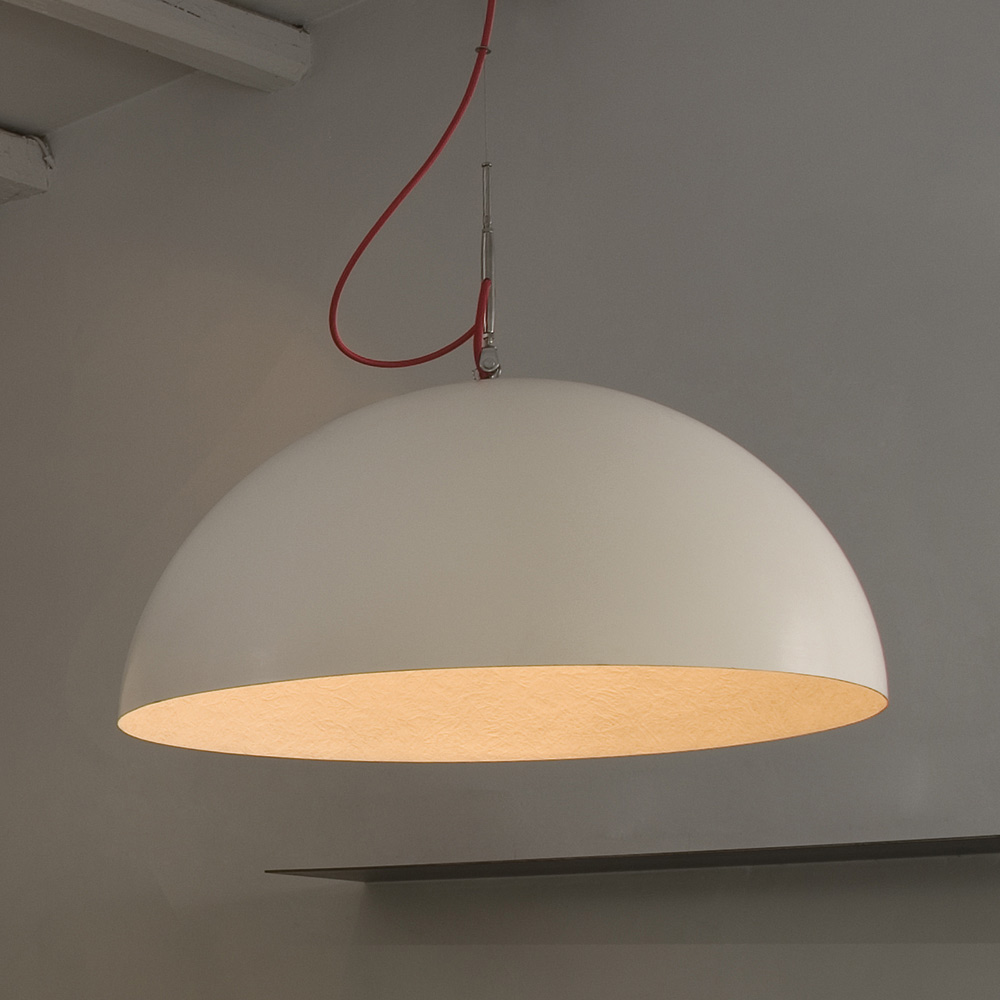 Feito com cuidado e atenção a cada detalhe, para recriar uma atmosfera lunar mágica; é a parte interna do abajur feita de Nebulita, um material composto de resina e fibra, cujos veios conferem à luminária esse efeito particular. O exterior do abajur em laprene e aço cria um contraste interessante com o interior.