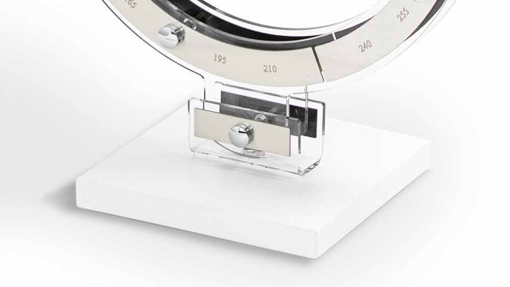 O suporte é feito de metacrilato transparente, latão cromado e MDF lacado.