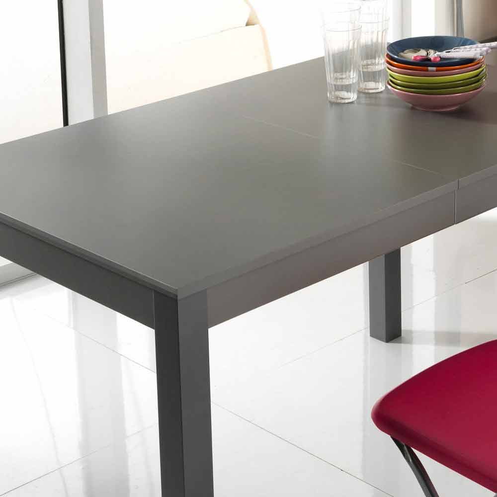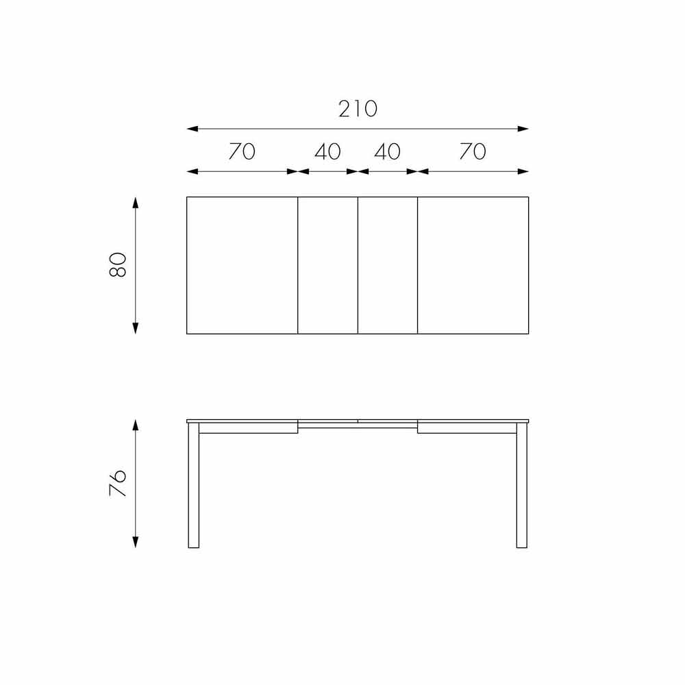 Mesa com base em madeira maciça de faia e tampo em melamina. Possui 2 extensões de 40 cm cada, alojadas dentro da mesa. Disponível em várias cores.