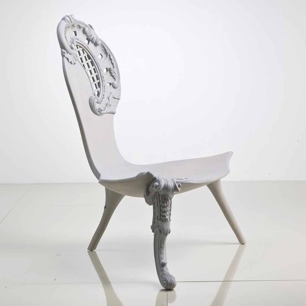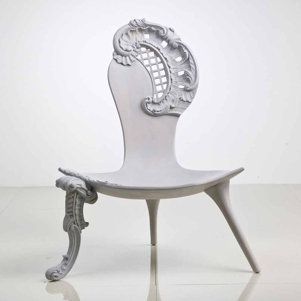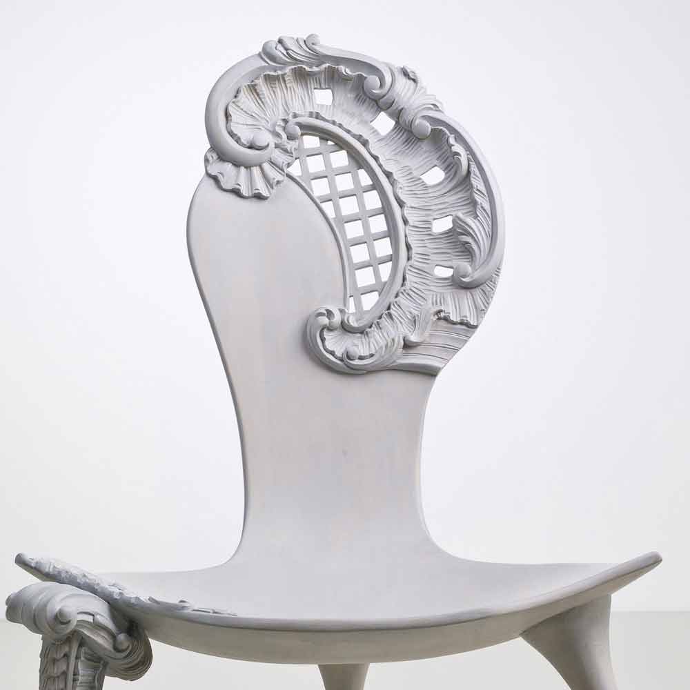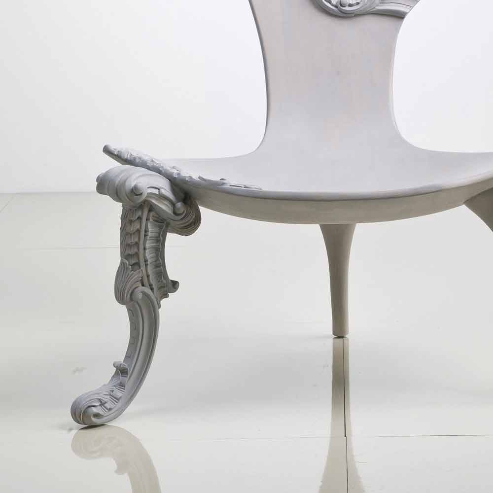 Leon é um trono esculpido à mão em madeira maciça com uma decoração barroca para trás e assento de madeira maciça. Uma folha de madeira lisa delineia o perfil suave em algumas de suas partes e evolui para um florescente trabalho barroco. Quase como se a madeira tomasse vida lentamente, na poltrona cresce uma espécie de chapéu floral com muito véu, enquanto a perna é enriquecida com cachos de madeira enrolados. Acabamento em carvalho cinza (cinza fumaça).