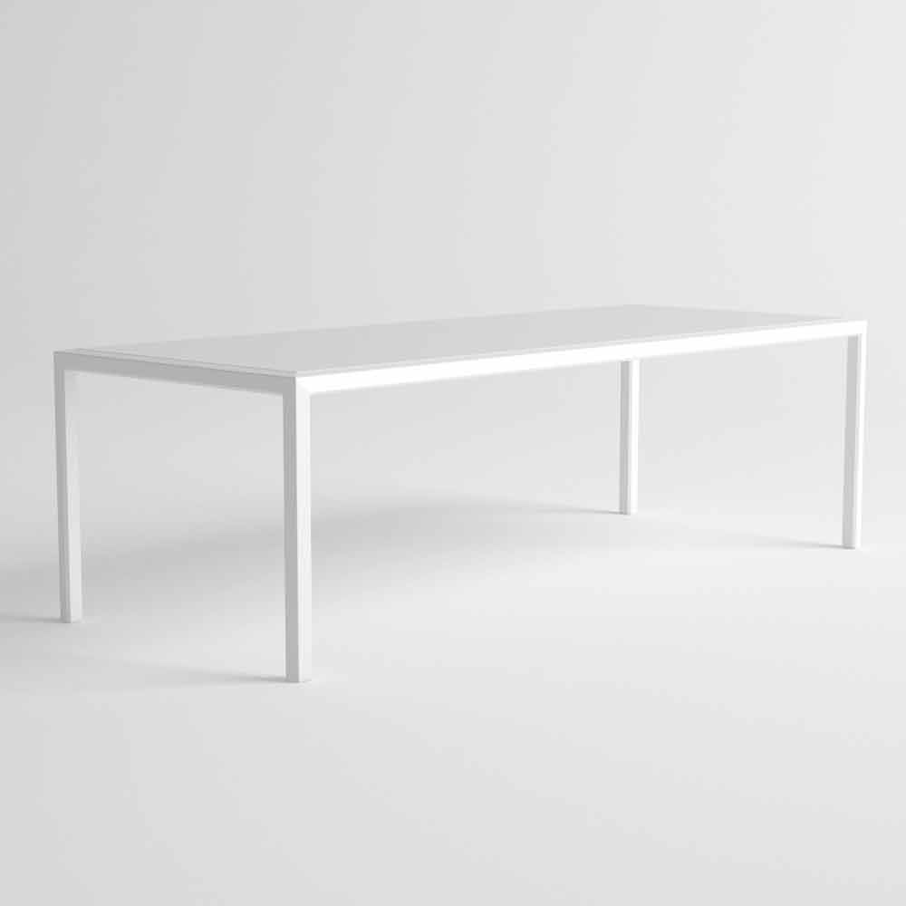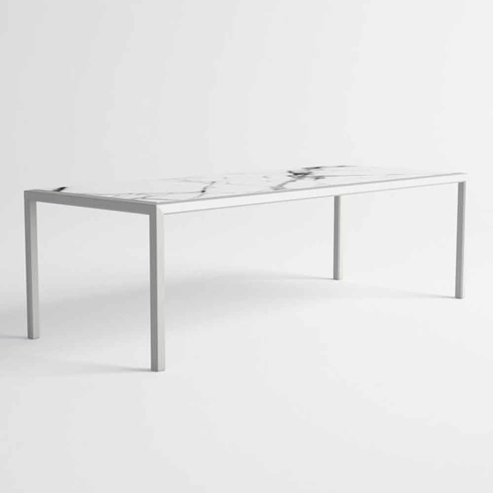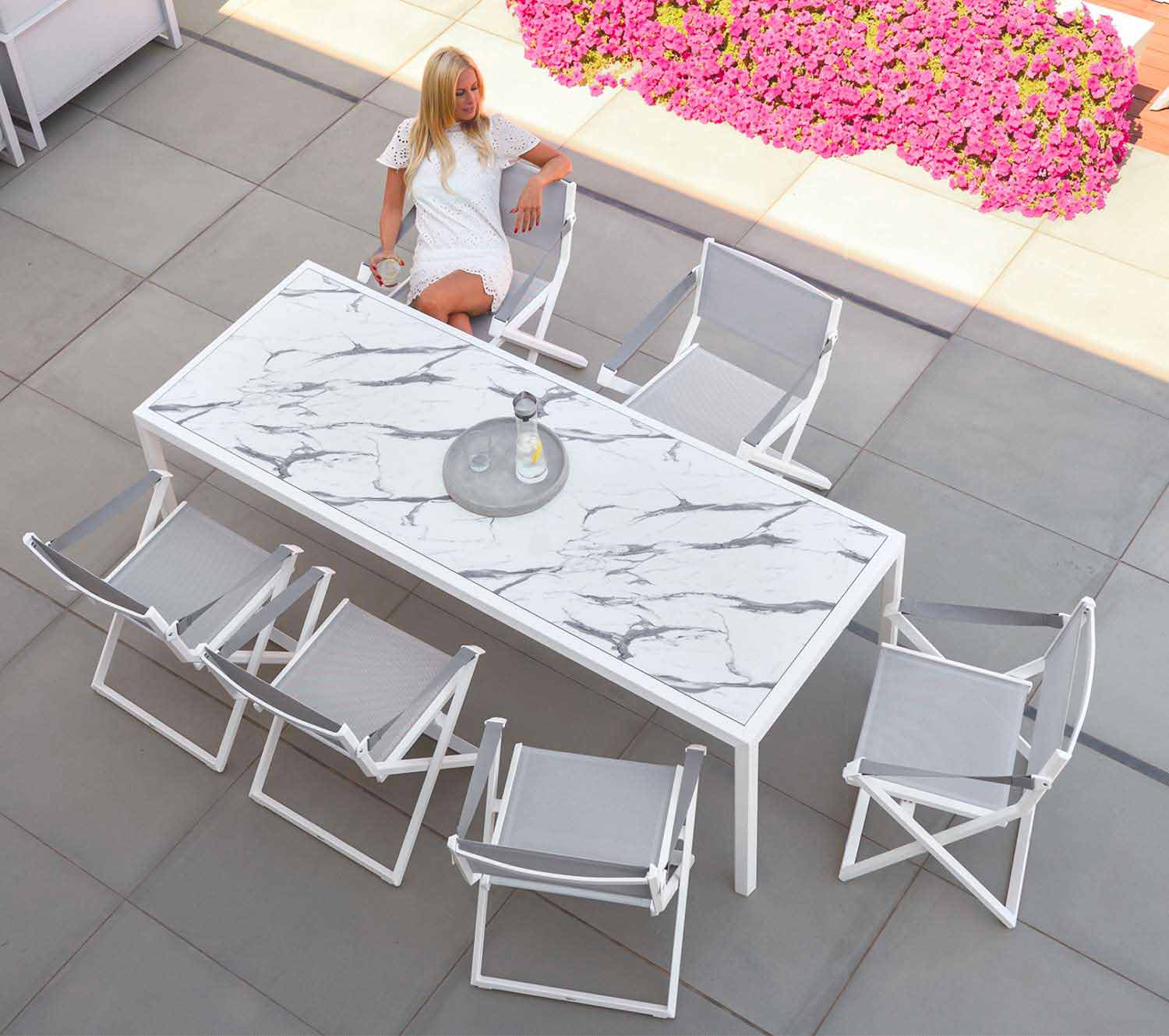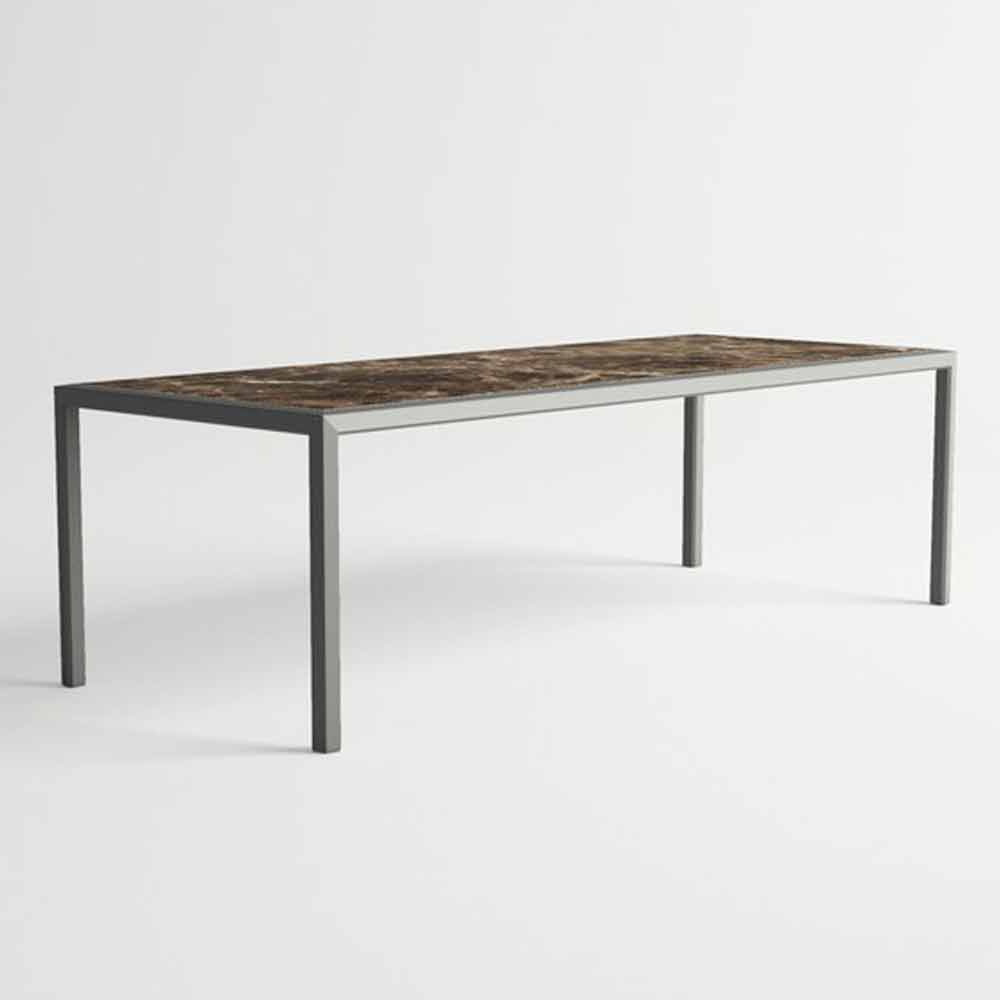 Mesa externa moderna, estrutura em alumínio e tampo em HPL laminado com design.