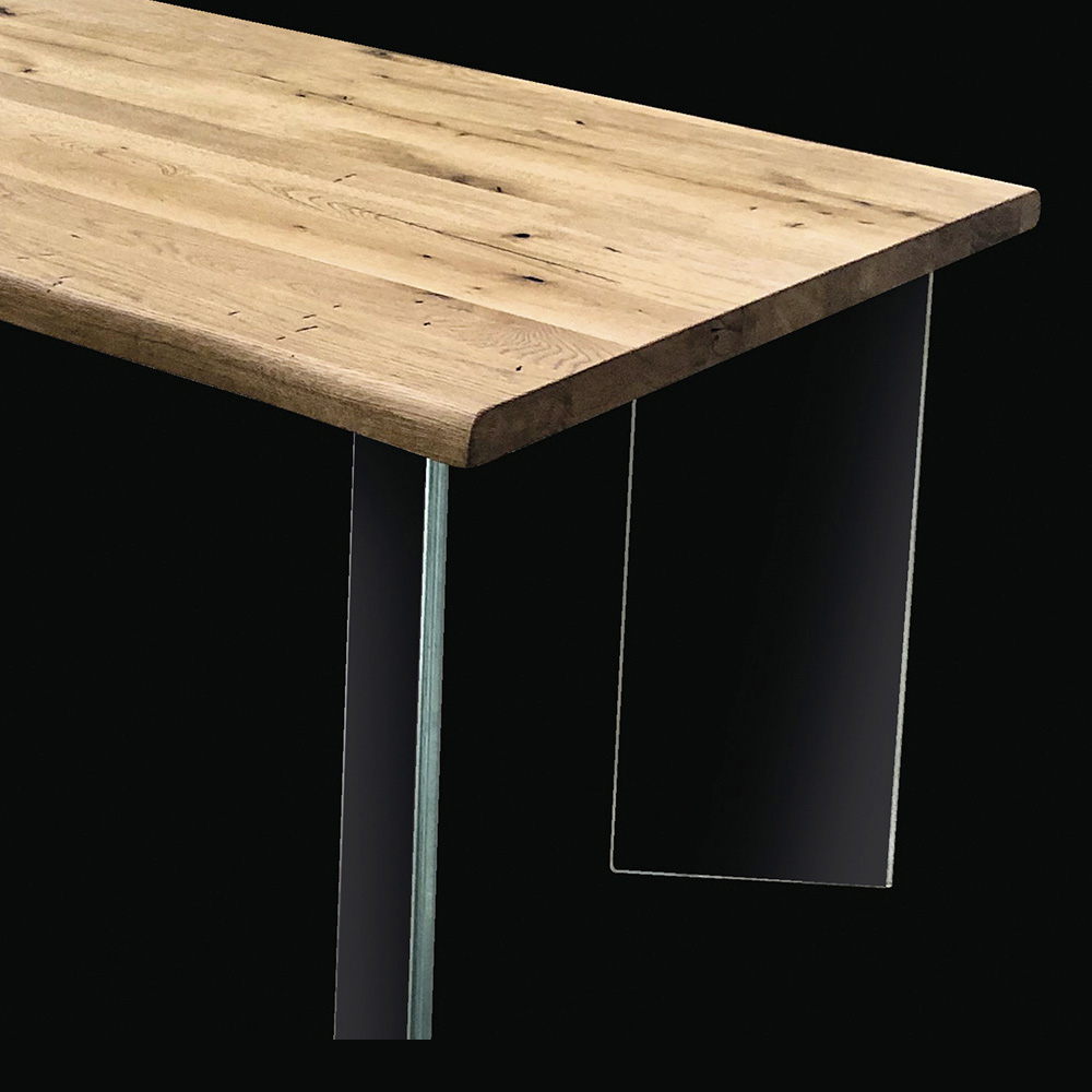 Mesa em madeira folheada a carvalho com nós e base em cristal Made in Italy.
