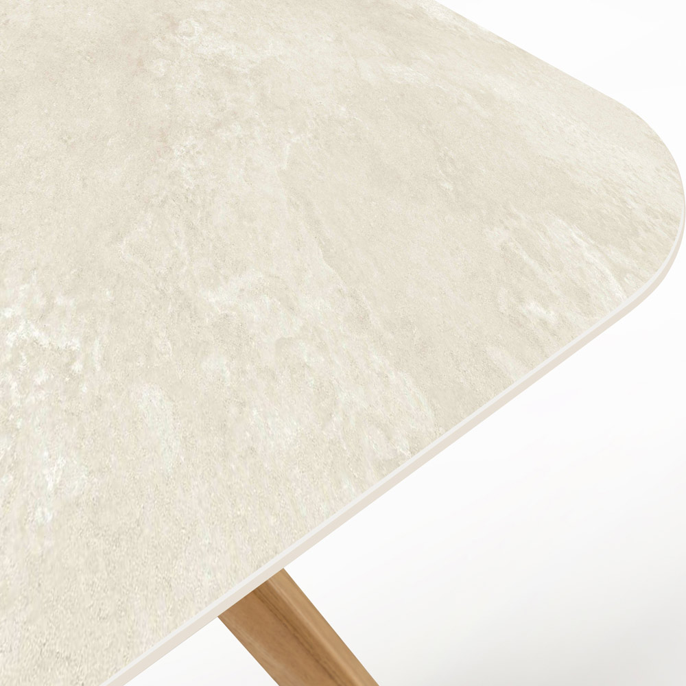 fabricada em Itália. Esta mesa para área externa é uma peça de design que eleva qualquer espaço externo com seu equilíbrio entre elegância natural e modernidade. Apresenta tampo de cerâmica inspirado na pedra Chianca di Ostuni , conhecida por sua cor neutra e textura que lembra pedras naturais, adicionando um toque de estilo rústico e contemporâneo.