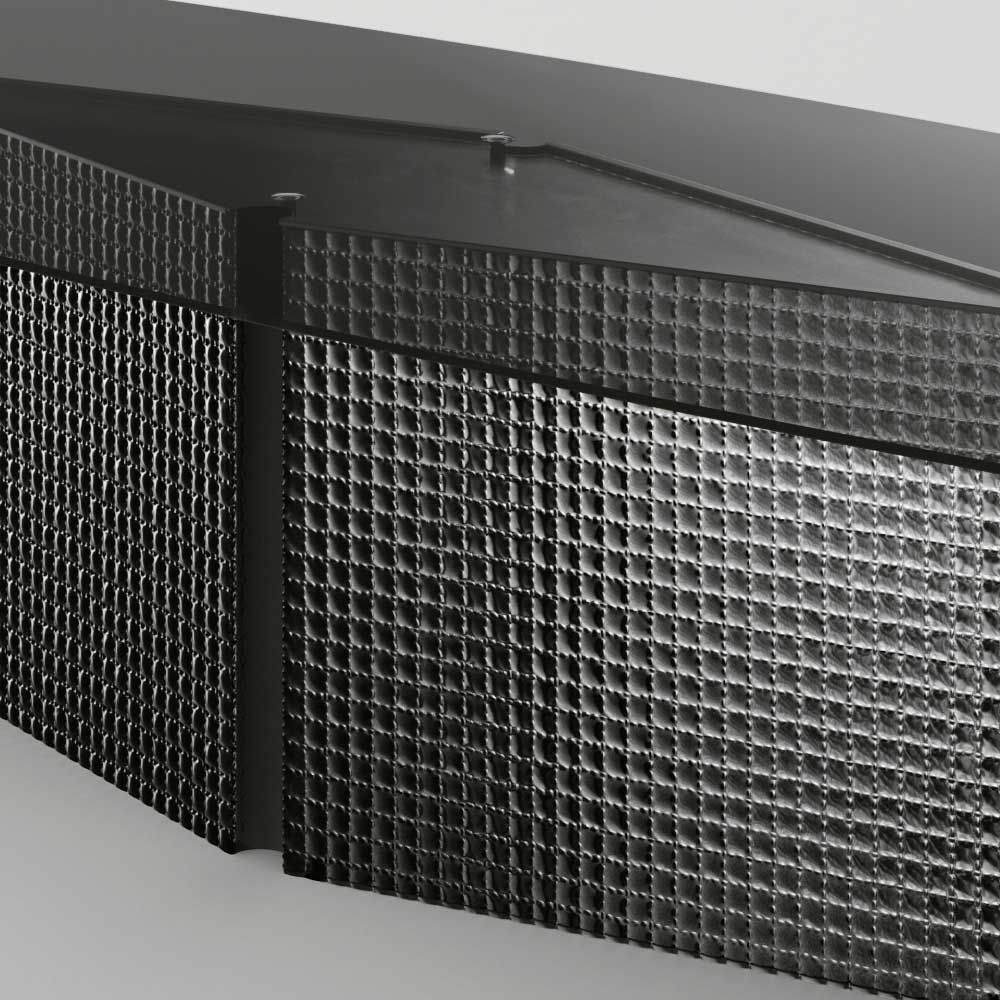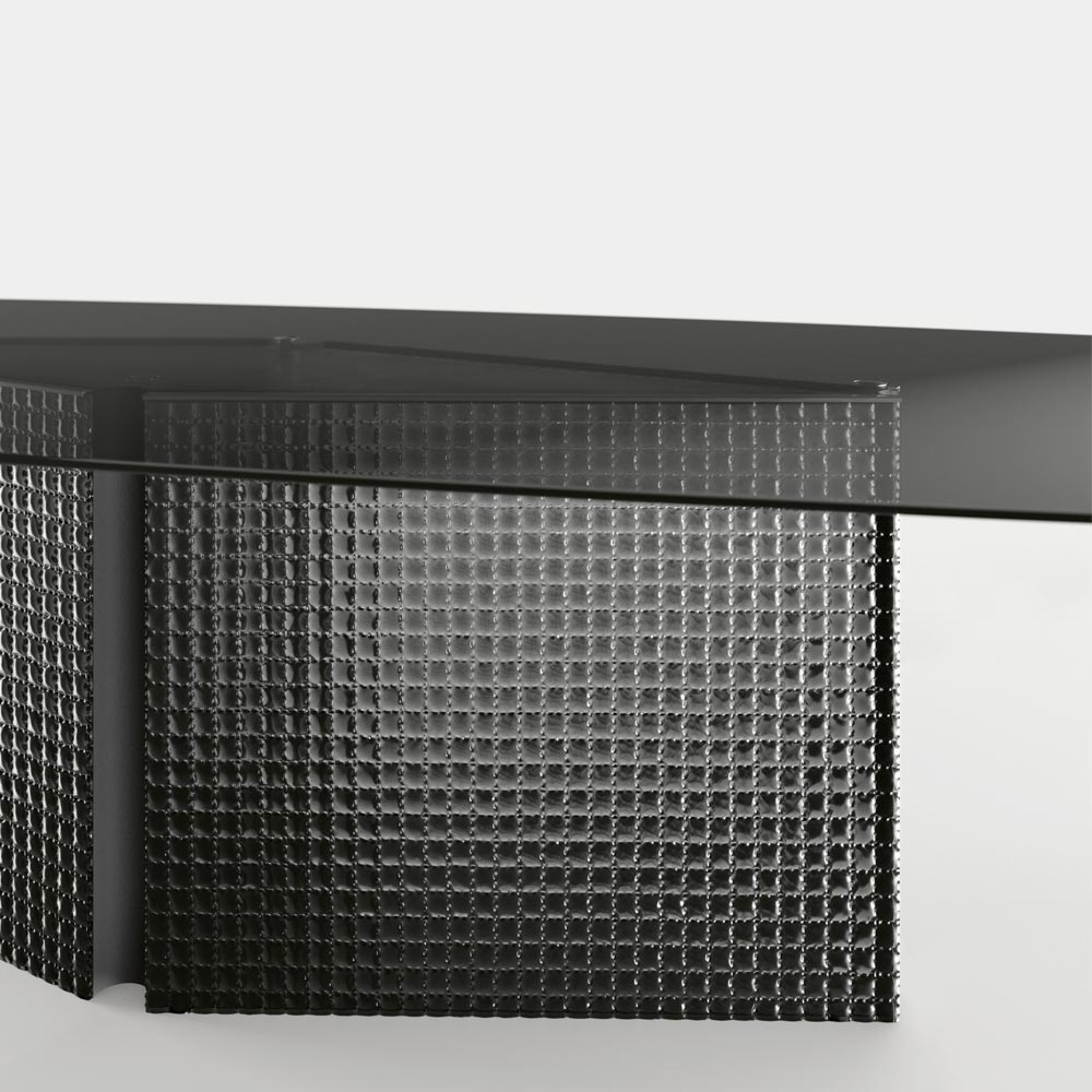moldado em vidro temperado fixado à base por placas de aço e base central composta por elementos