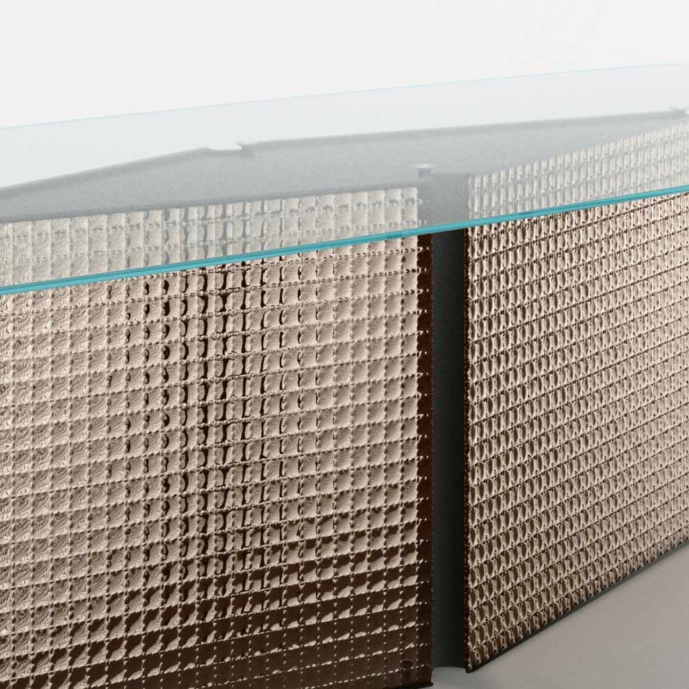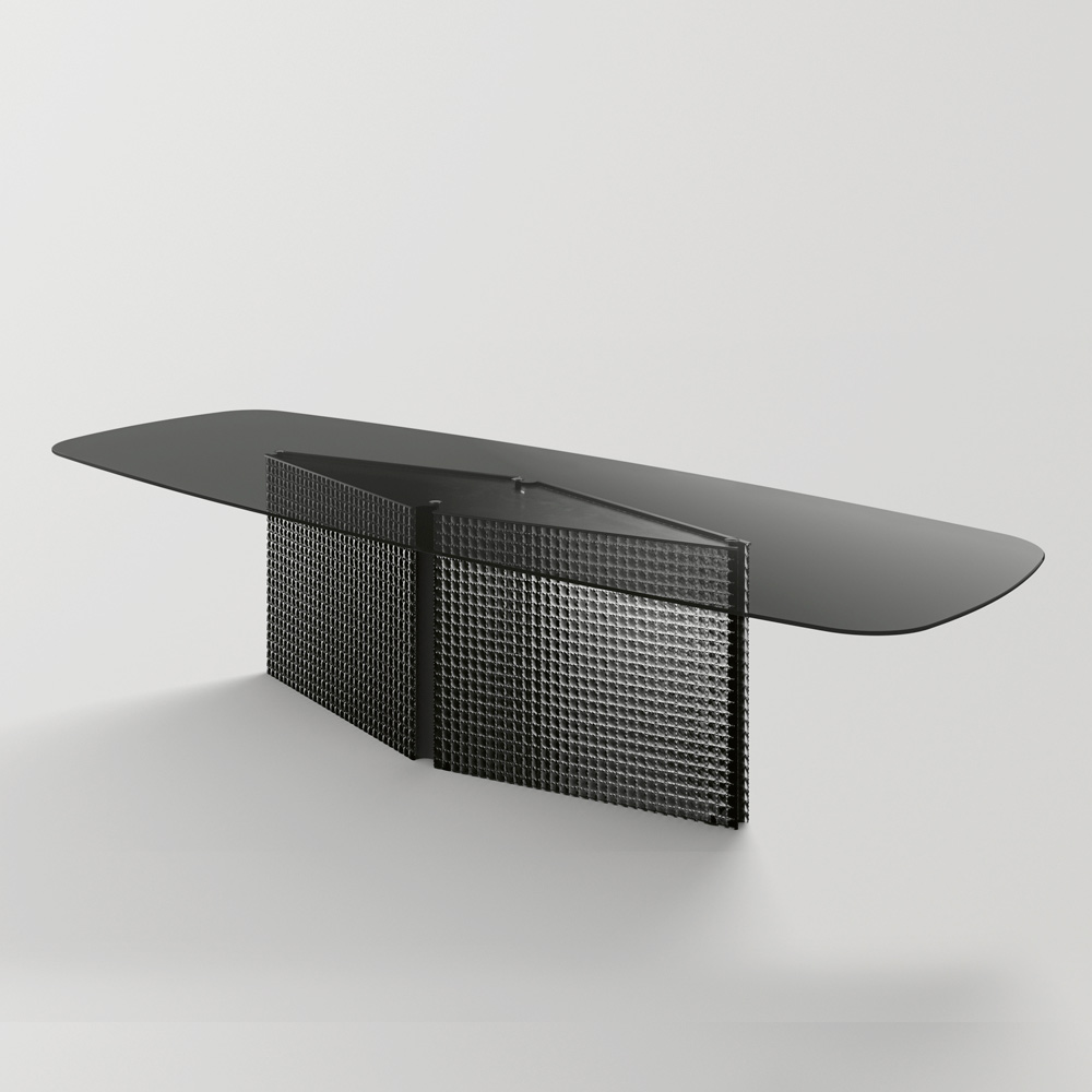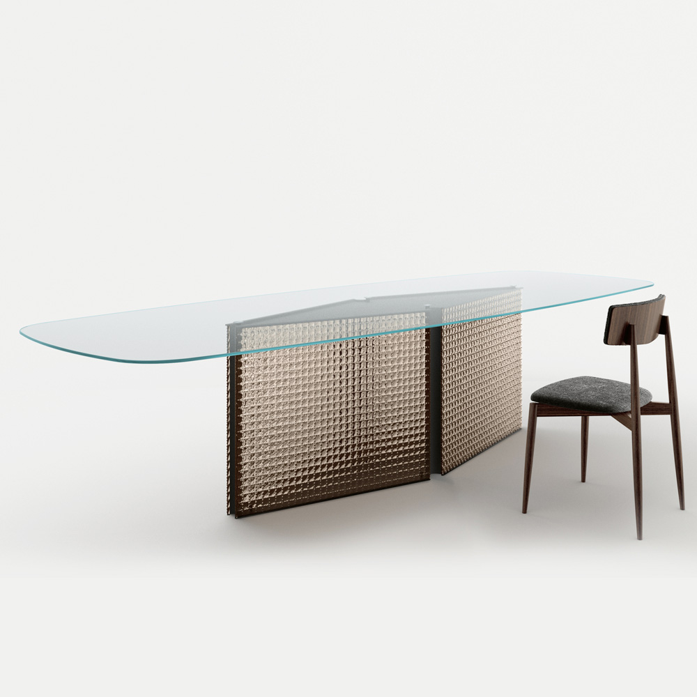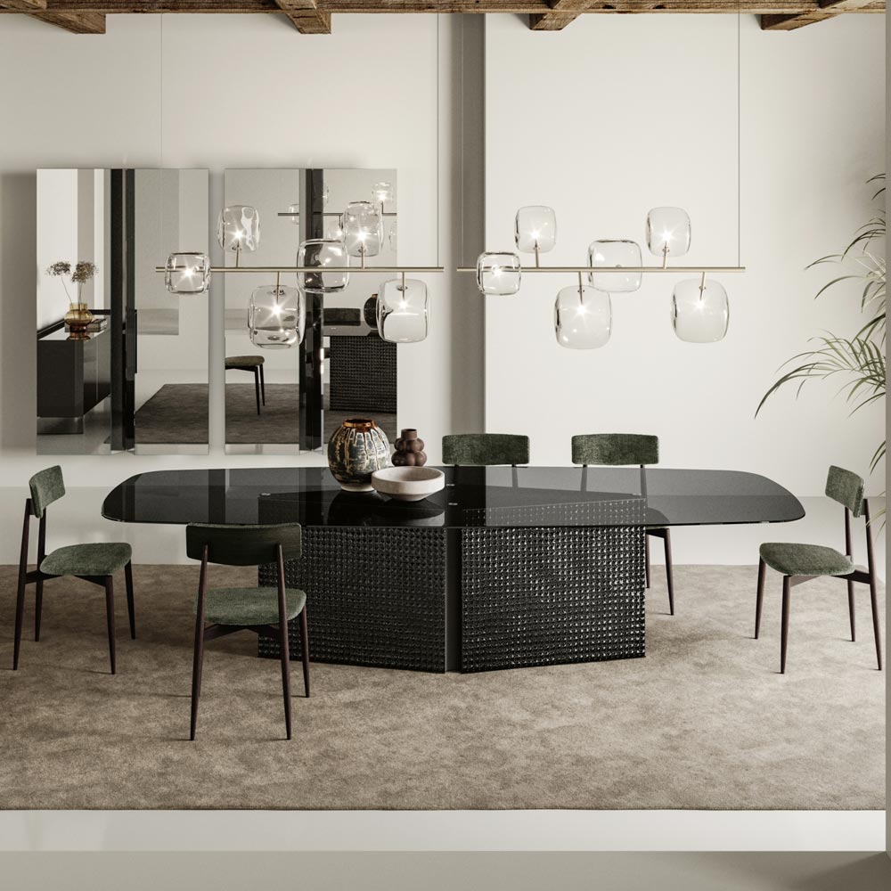 Esta mesa de jantar é um exemplo de design vanguardista que combina elegância e funcionalidade . A sua silhueta esbelta e alongada com tampo em vidro oferece uma superfície lisa e refinada, ideal para jantares formais ou como ponto focal num espaço de design contemporâneo.