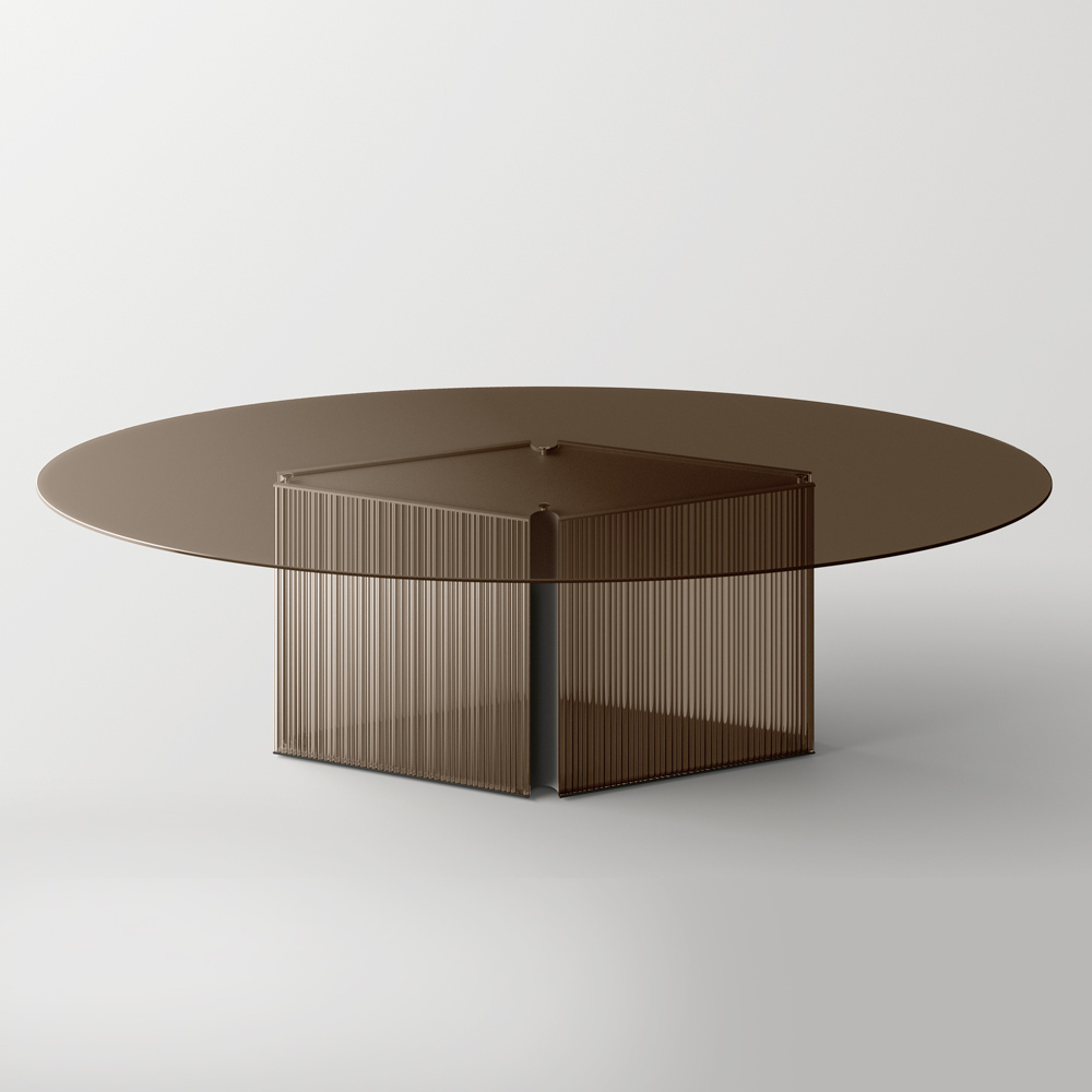 O verdadeiro atrativo desta mesa está em sua base única, com finas tiras verticais de vidro que não apenas sustentam o tampo, mas acrescentam um elemento de textura e movimento visual . Estas linhas, com o seu aspecto quase escultural, criam um interessante jogo de luz e sombra, transformando a mesa numa escultura moderna.