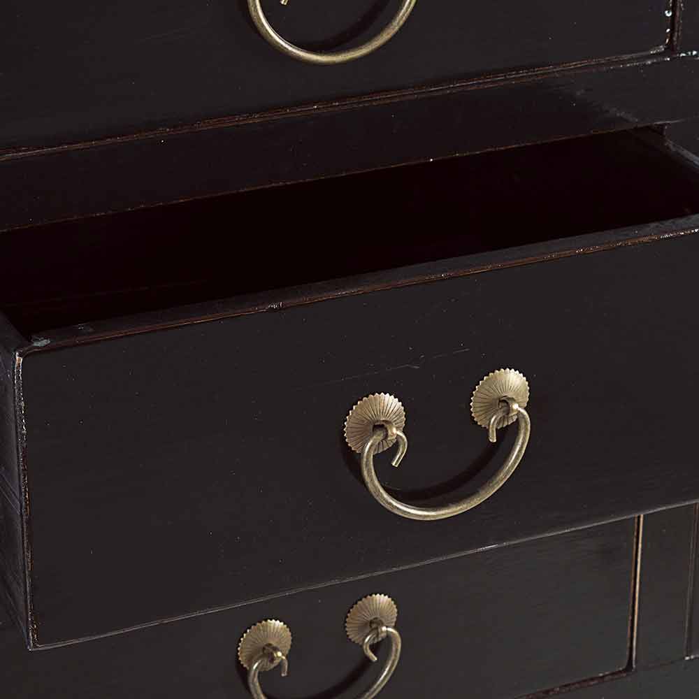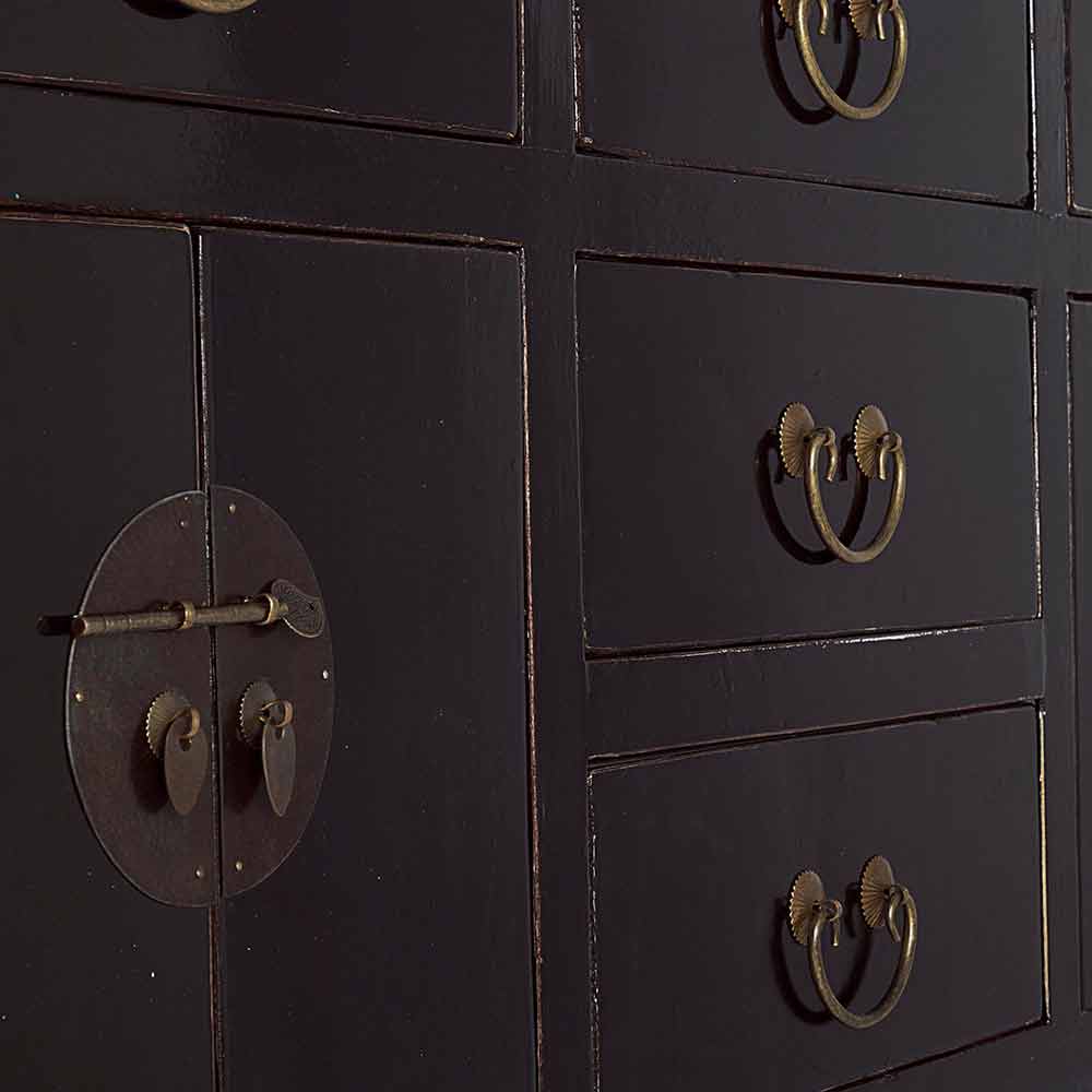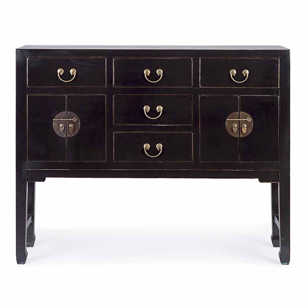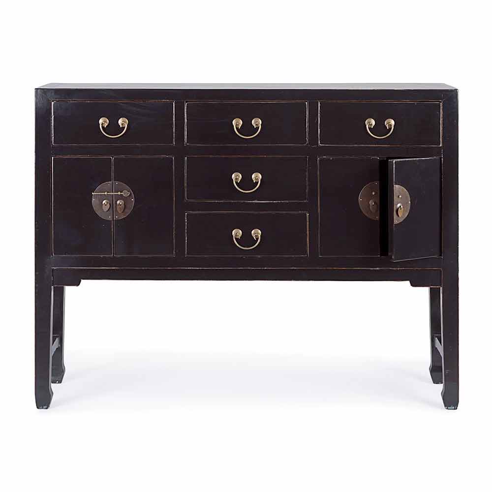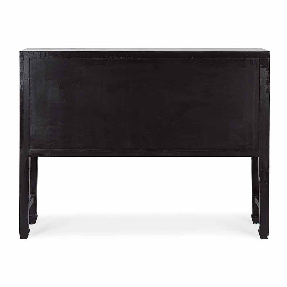 Mesa consola preta em madeira de olmo com 5 gavetas e 4 portas de design vintage.
