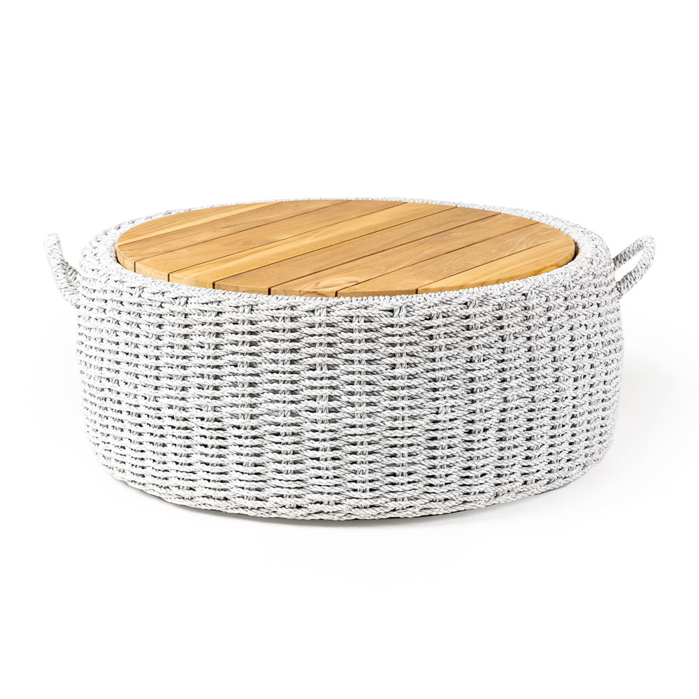 Esta mesa de café ao ar livre é feita com uma estrutura interna em alumínio revestido a pó epóxi quadro com teca base e inserção de corda VRO tecida à mão. Esta coleção combina a beleza da teca com a sabedoria artesanal da tecelagem.