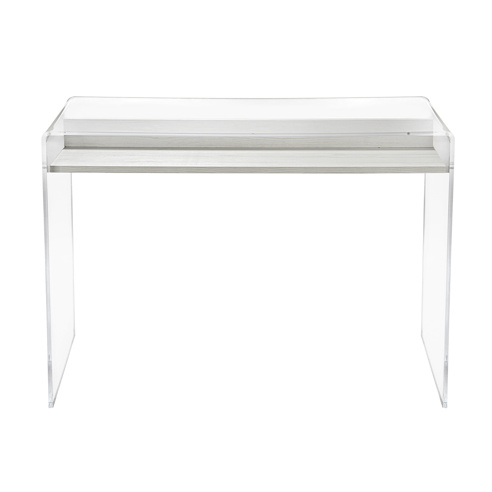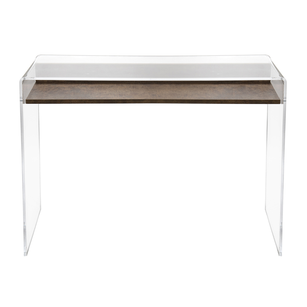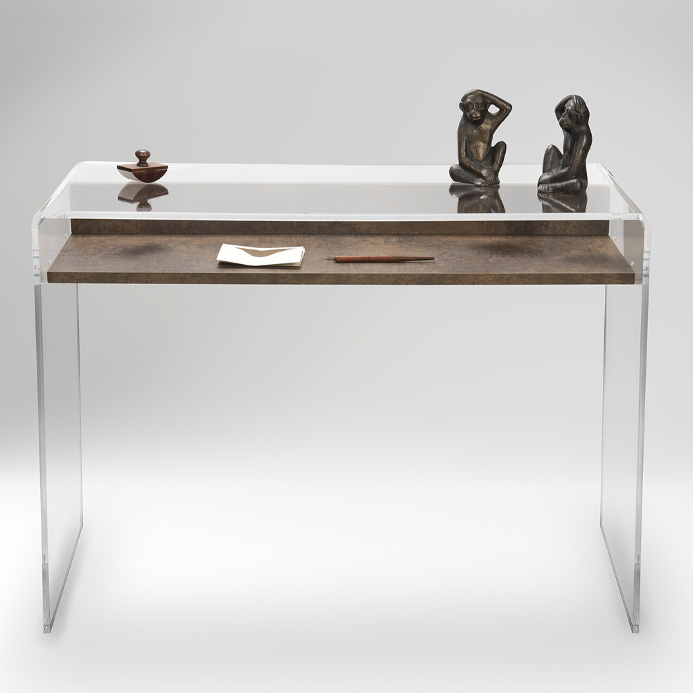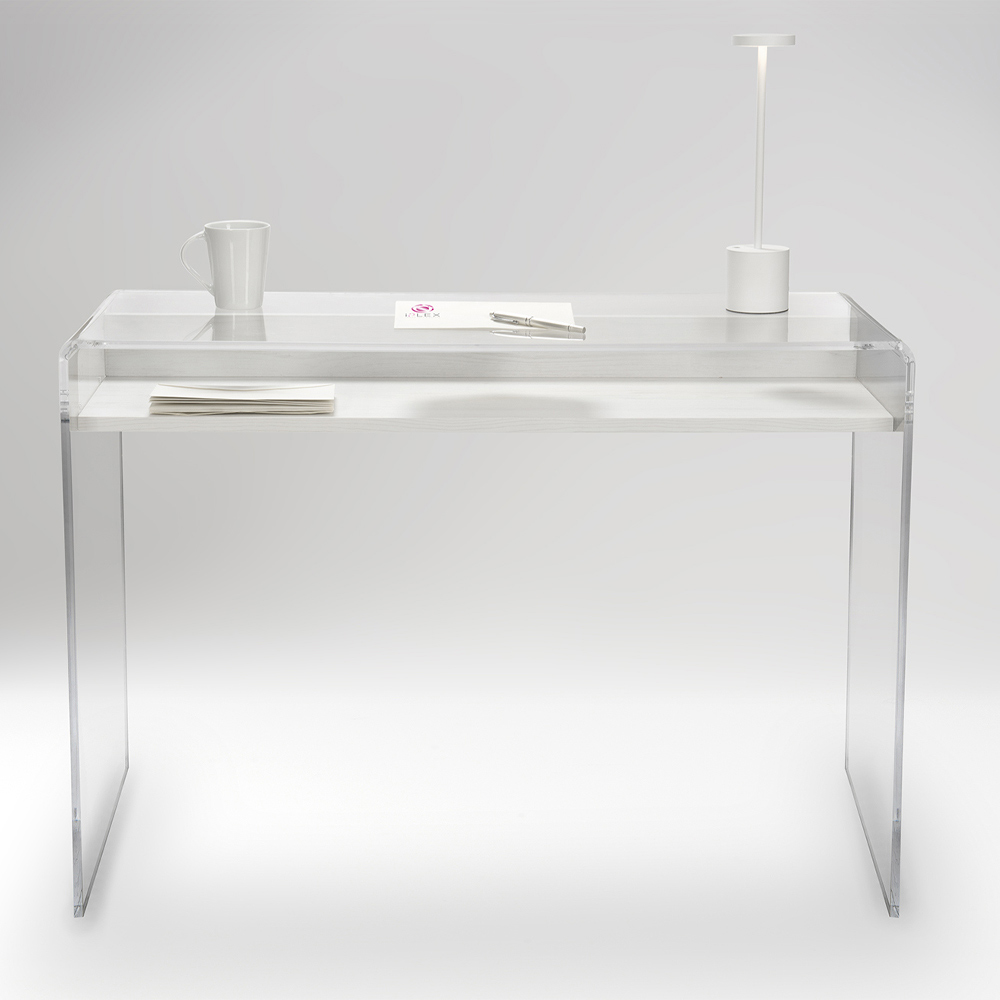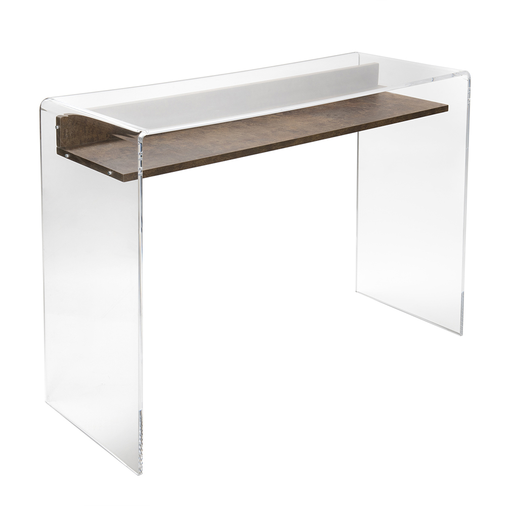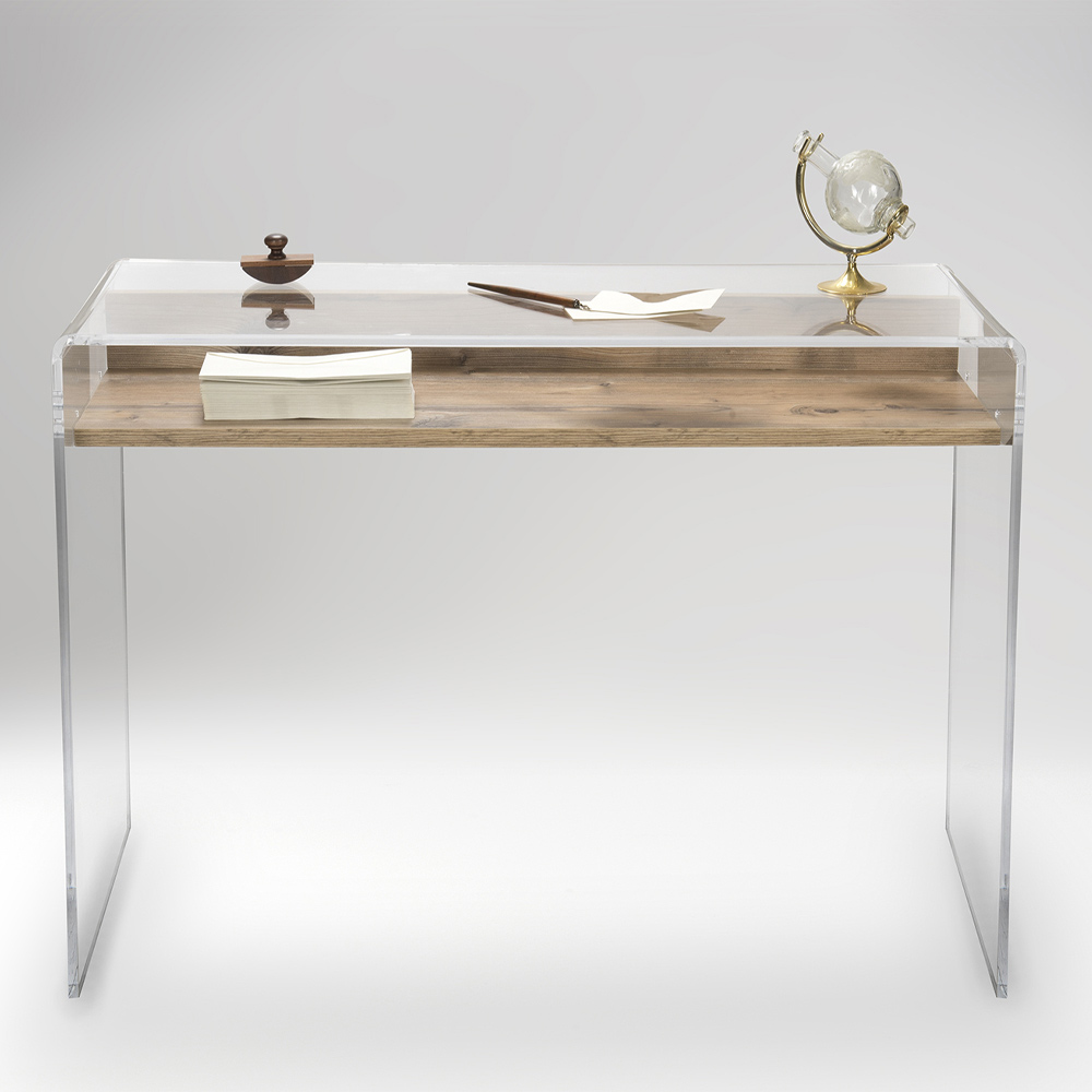 Console de design moderno em plexiglass transparente cortado a laser com prateleira de madeira, design made in Italy.