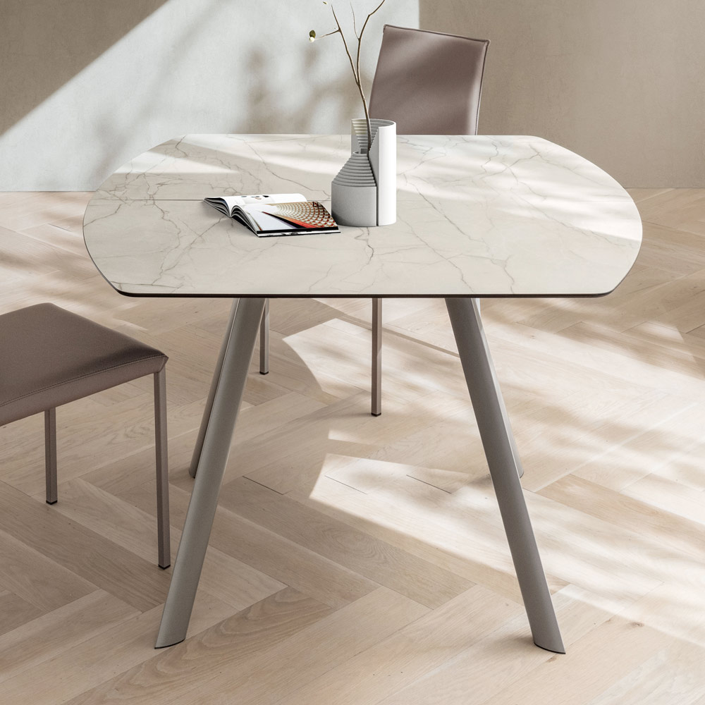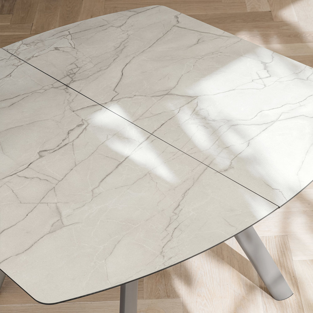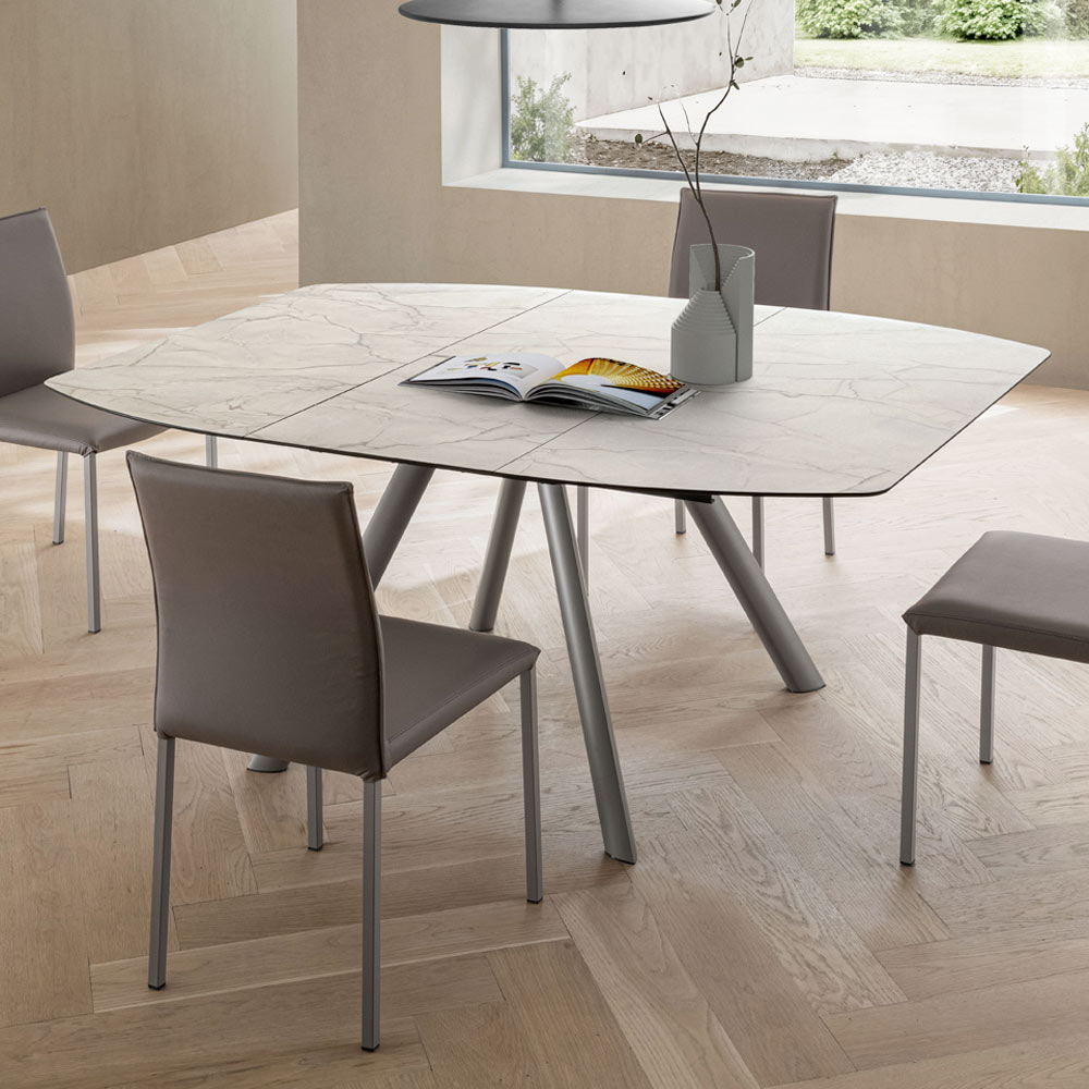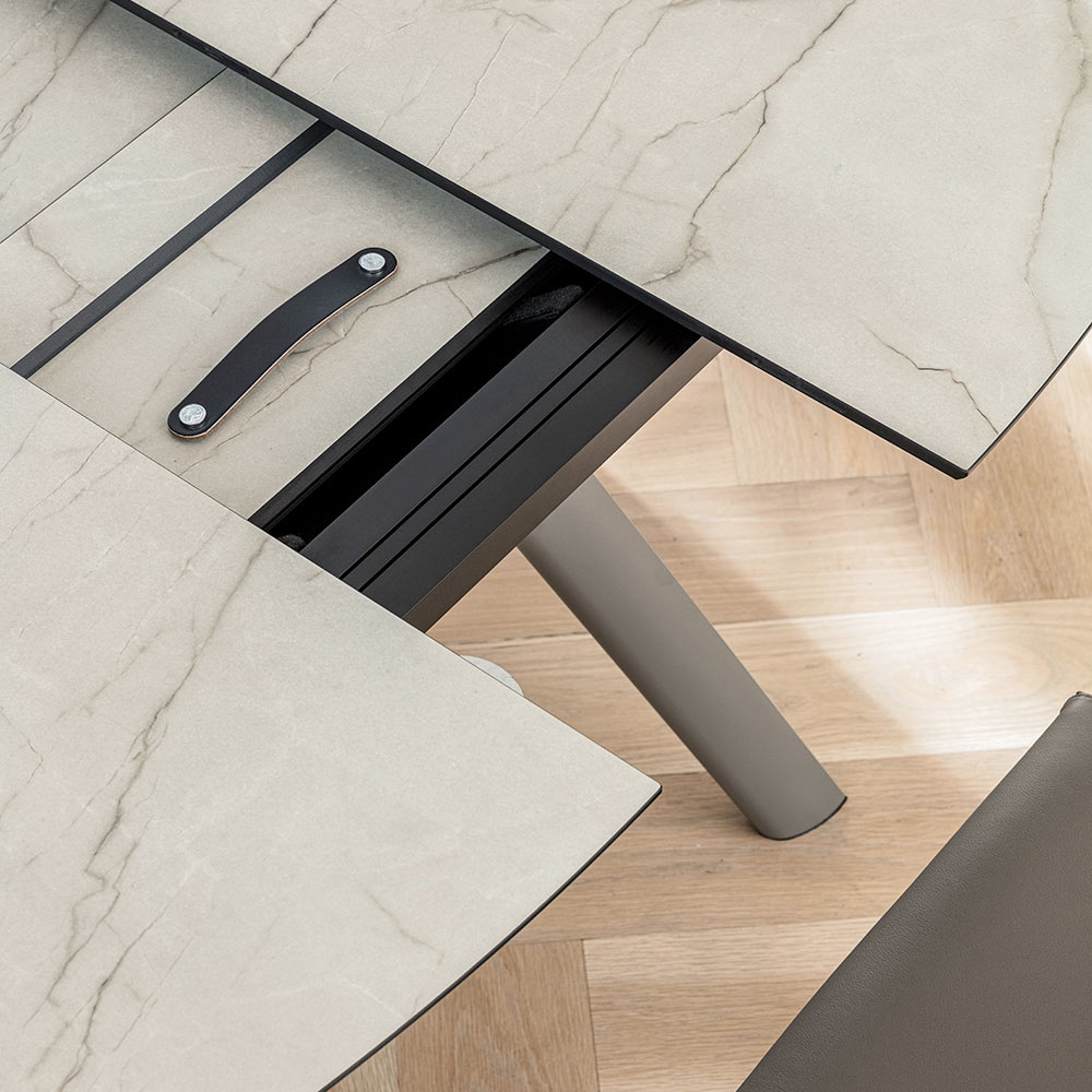 O tampo em HPL adiciona brilho e requinte ao ambiente, remetendo aos veios da pedra com uma superfície resistente . Graças ao sistema de extensão central , a mesa se estende facilmente, oferecendo espaço adicional para convidados ou almoços em família, mantendo uma linha harmoniosa mesmo quando aberta.