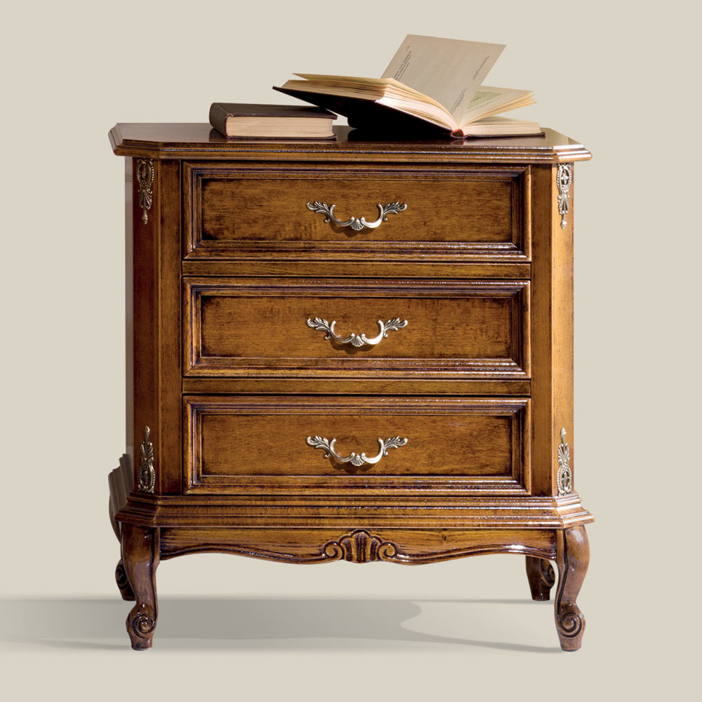 Mesa de cabeceira de estilo clássico adequada para se encaixar elegantemente no ambiente do quarto ou na sala de estar, criando uma atmosfera refinada e eficaz. É feito de madeira de nogueira Bassano e tem 3 gavetas práticas. Totalmente feito na Itália e feito à mão por mestres artesãos qualificados , finalizado com sabedoria e gosto pela elegância. A produção é realizada com materiais nobres , realizando o trabalho à mão com o máximo cuidado e profissionalismo que distingue os produtos Made in Italy .