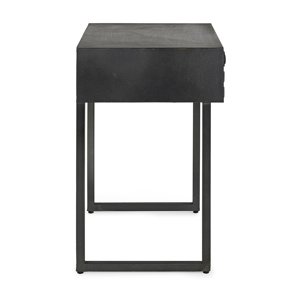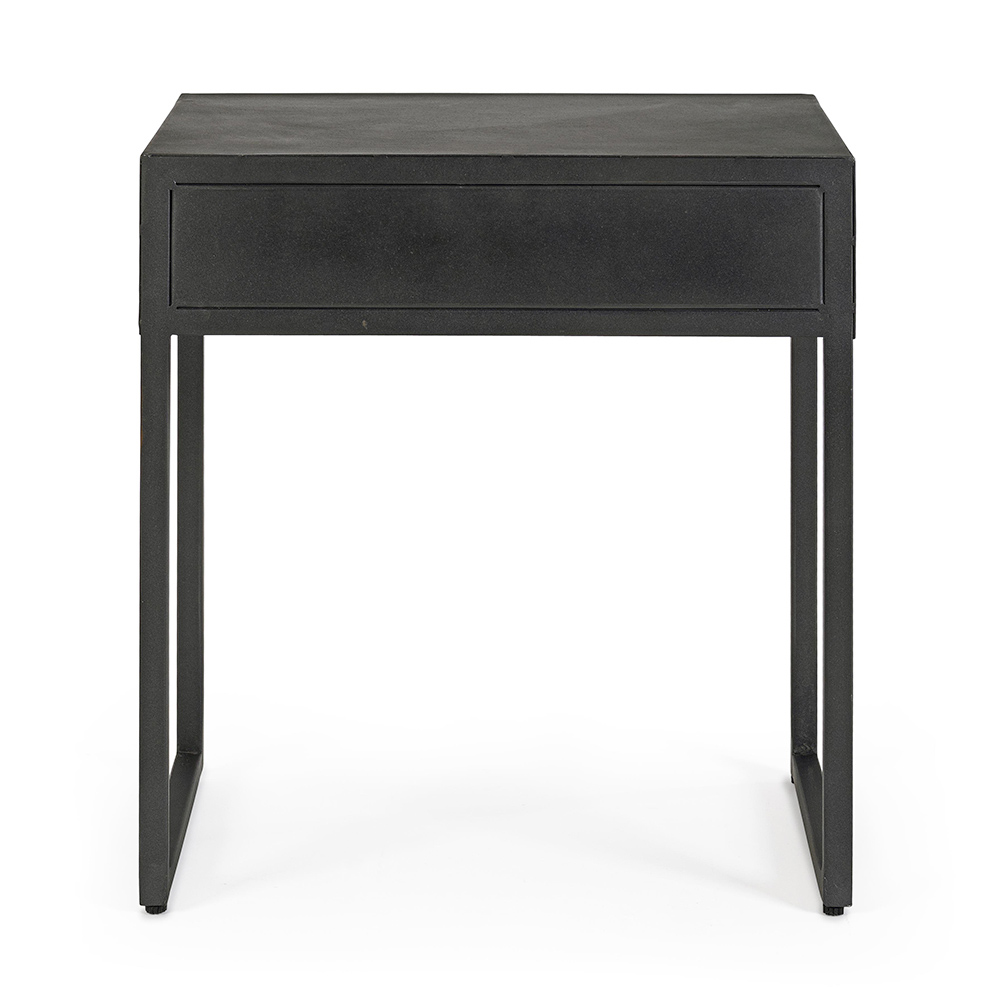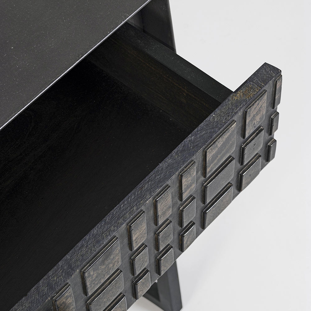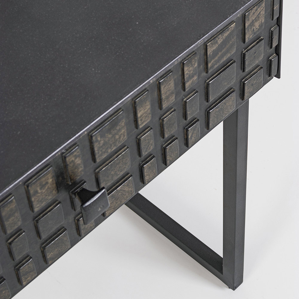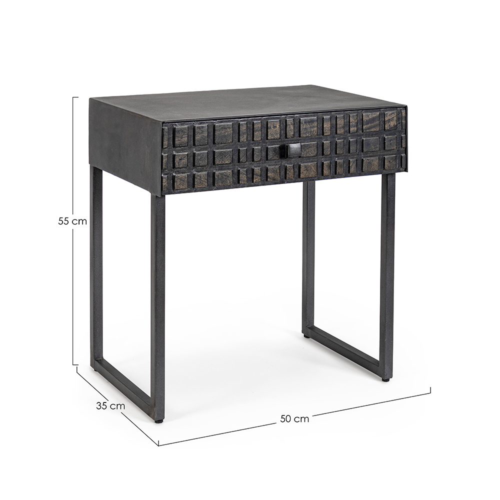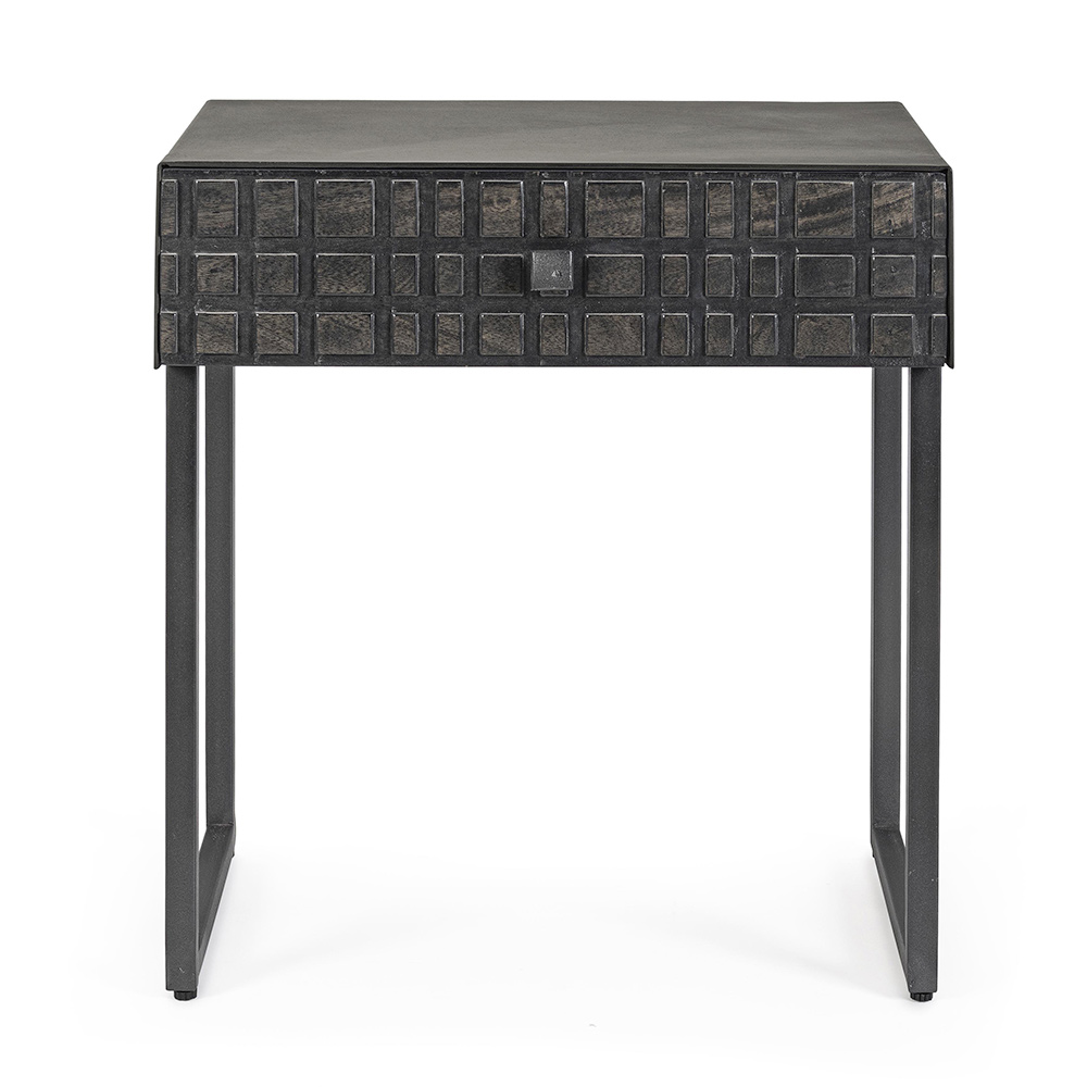 Mesa de cabeceira em aço com gaveta em madeira de manga de desenho étnico.