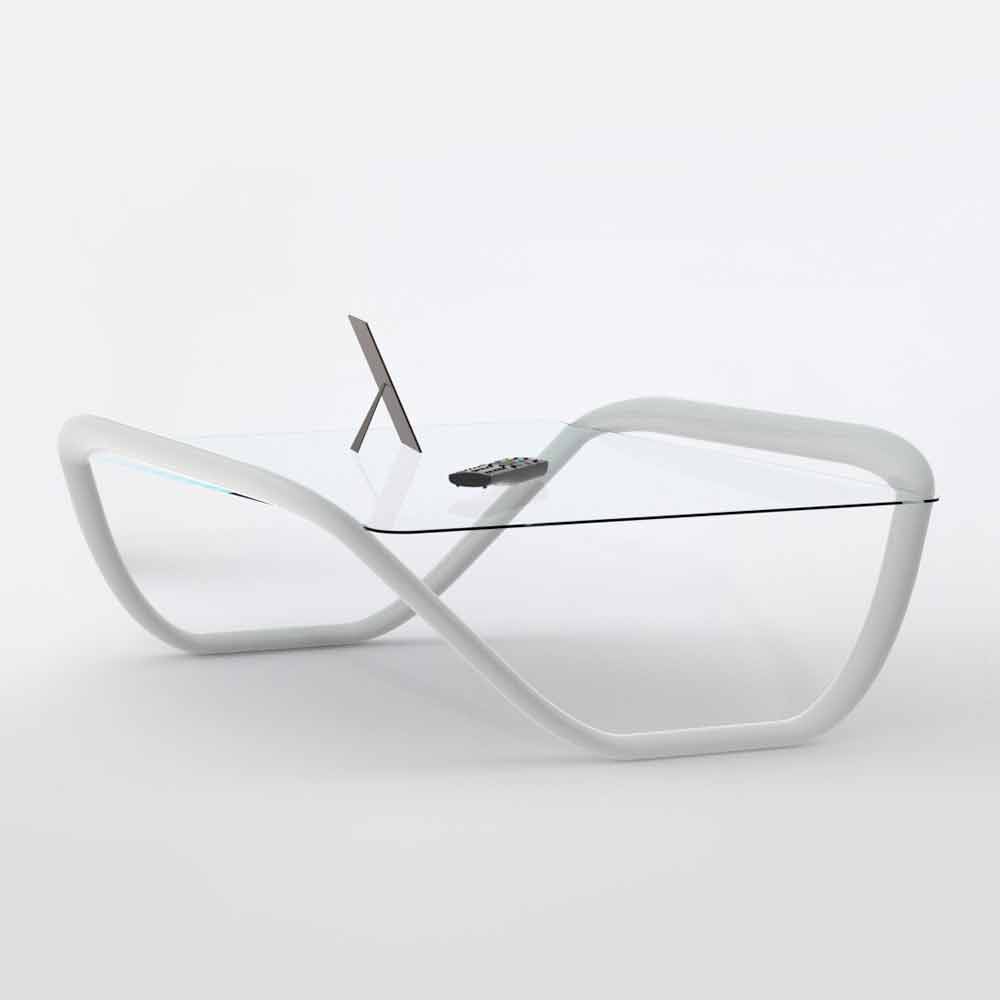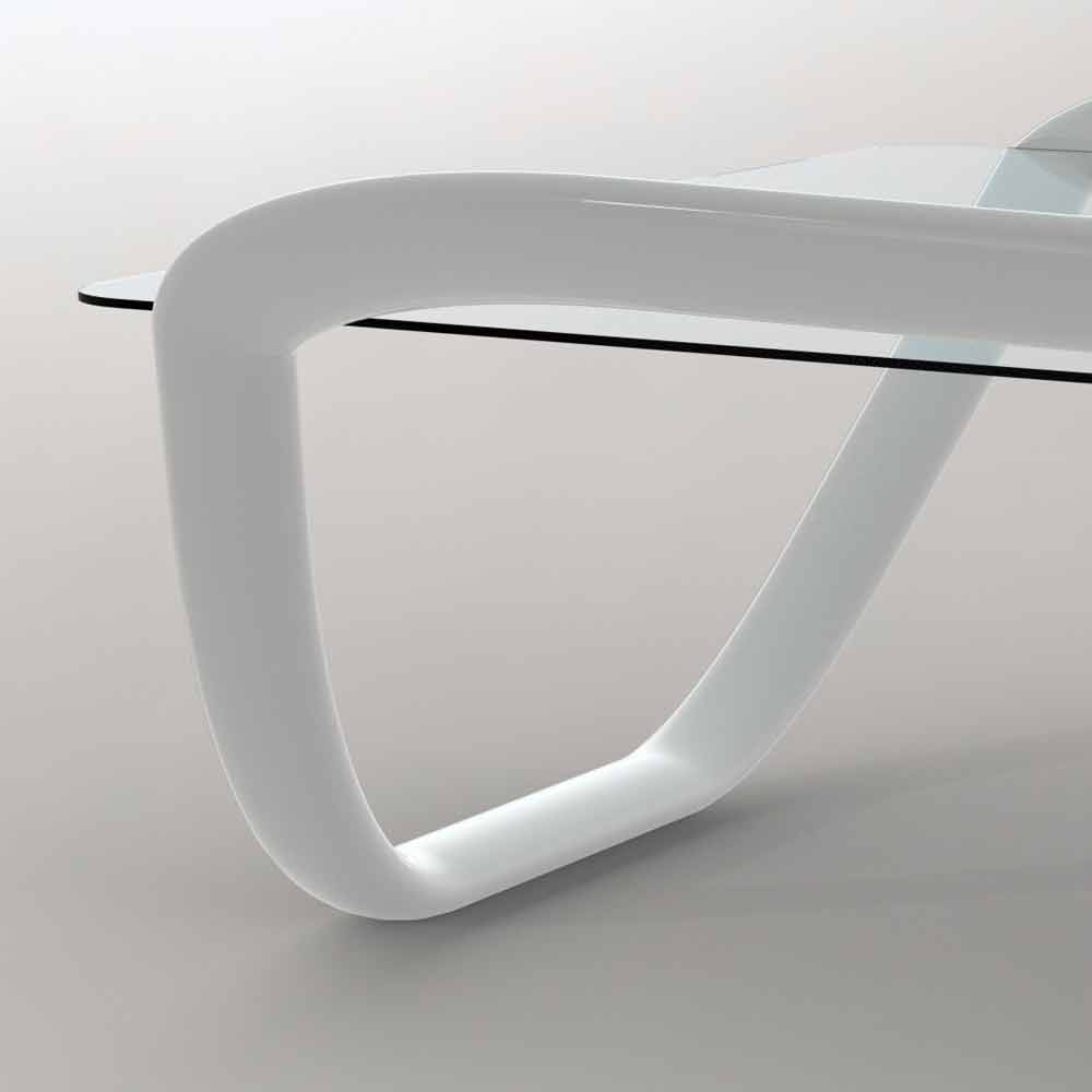 Mesa de centro feita com estrutura Solid Surface; para uma proposta caracterizada pelo sinal simples e sugestivo de uma linha contínua sinuosa. Uma solução formal essencial, capaz de personalizar o ambiente. A transparência do tampo de vidro permite realçar as linhas suaves da estrutura. Uma forma única na continuidade do espaço. Com acabamento lacado branco brilhante / fosco (RAL9003).