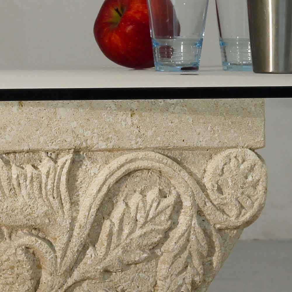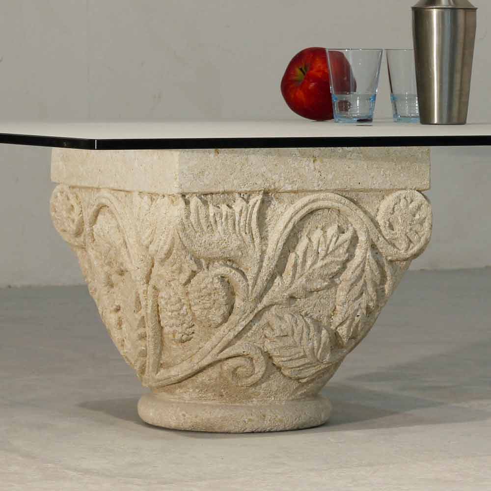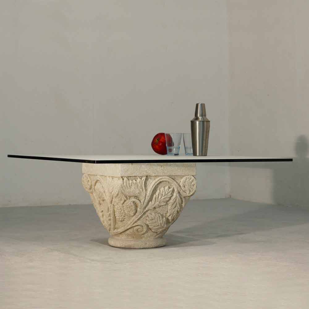 A mesa de café Mytros é inteiramente feita na Itália . Sua base é feita de pedra natural Vicenza e foi esculpida à mão a partir do bloco de pedra original. O tampo da mesa é feito de cristal float (12 mm de espessura), colocado na base.