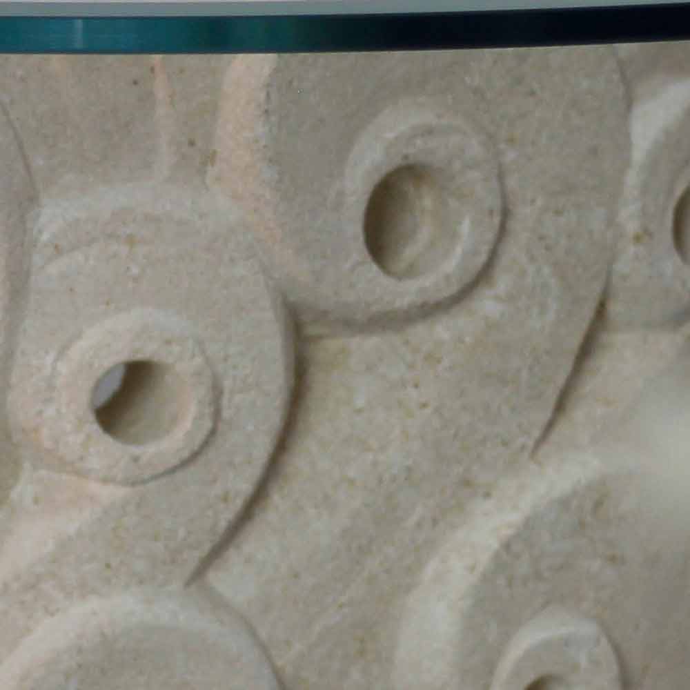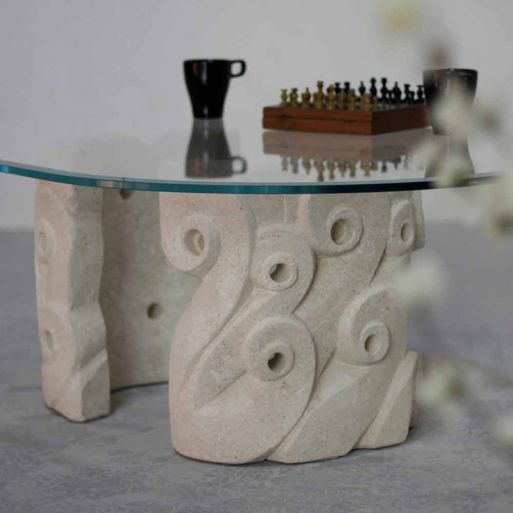 A mesa de café Lindos é inteiramente feita na Itália . Sua base é feita de pedra natural Vicenza e foi esculpida à mão a partir do bloco de pedra original. O tampo da mesa é feito de cristal float (12 mm de espessura), colocado na base.