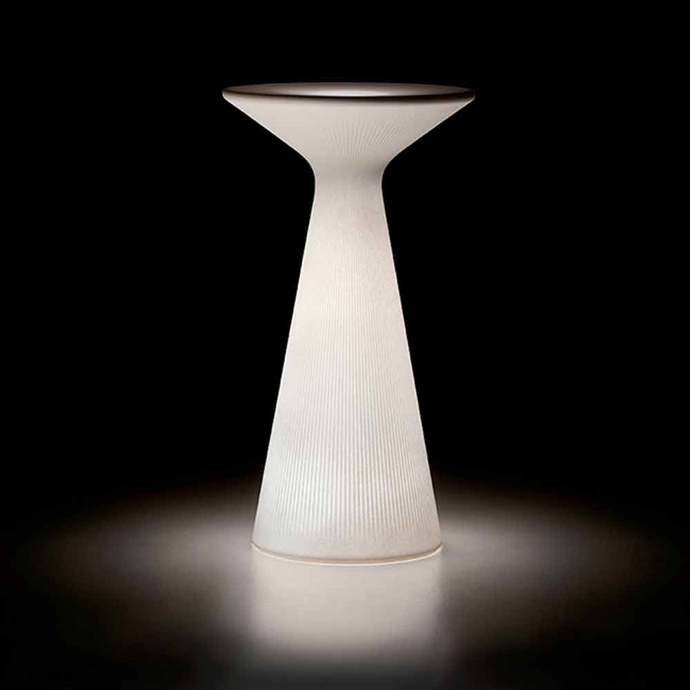 Rodada mesa de café ao ar livre feito na Itália com estrutura em polietileno branco caracterizada pela particular superfície listrada que cobre toda a base, criando jogos originais de luz e sombra. Juntamente com esta característica, o que torna o design deste produto único e particularmente interessante é a luz RGB LED que cria ambientes modernos e cativantes ideais para noites maravilhosas com amigos em espaços exteriores domésticos, como jardins ou terraços, mas também em ambientes de contratação em que uma forma única e criativa sem descurar o aspecto funcional fundamental do produto.