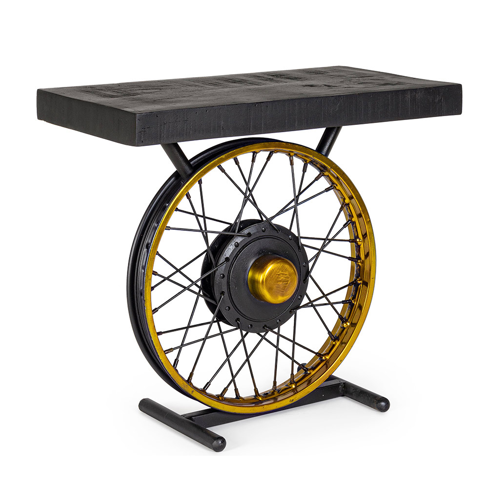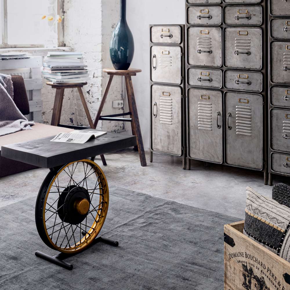 Mesa de centro para sala em aço e madeira de manga desenho industrial com roda.