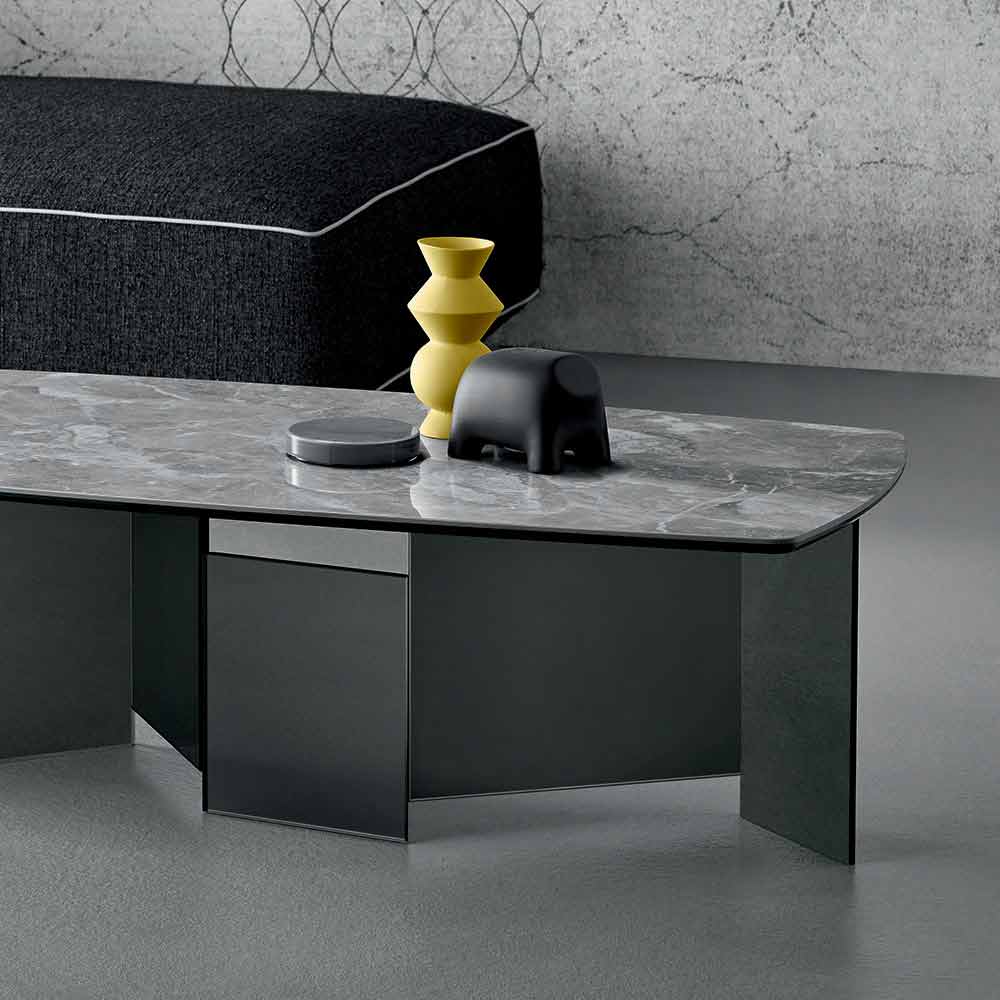 Fabricado em vidro fumê para a base e tampo em cerâmica oróbica cinza brilhante , é um móvel feito à mão na Itália com materiais de alta qualidade ideais para a sala de estar.